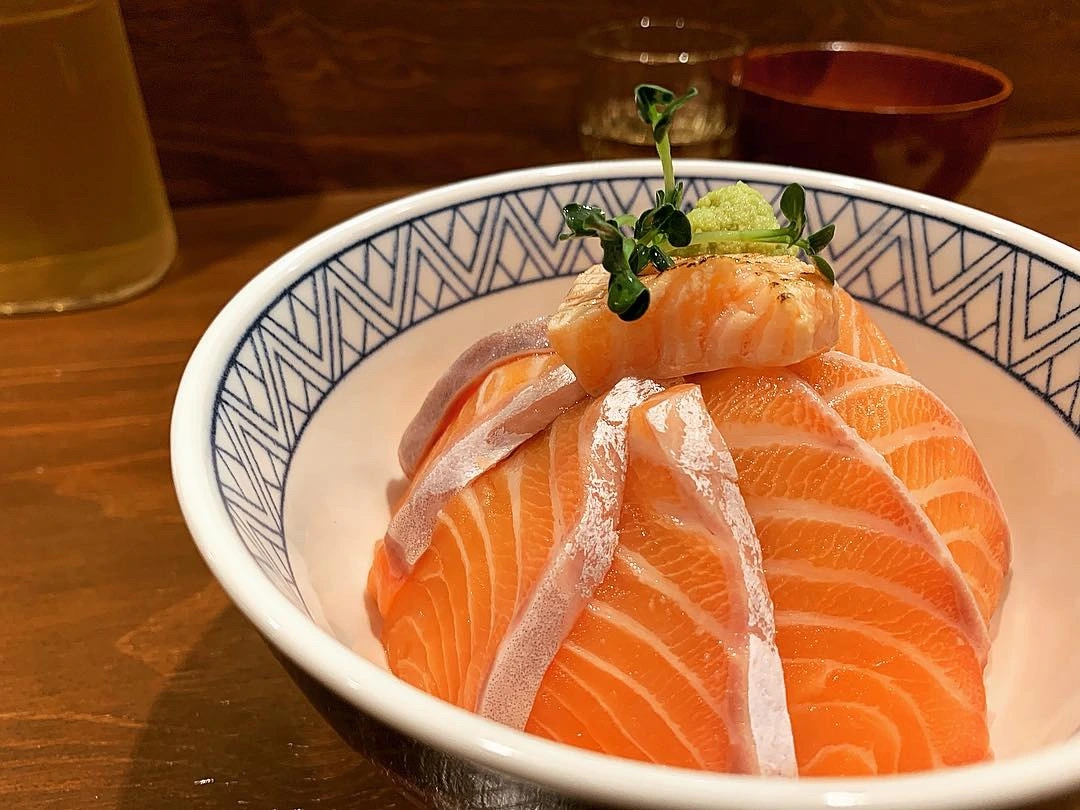 정갈한 볼에 담겨 나온 사케동, 데코레이션이라고는 간 와사비와 새싹 몇 점 그리고 구운연어살, 단정한 한 그릇에 담긴 맛 또한 공간의 느낌과 닮아 있다.