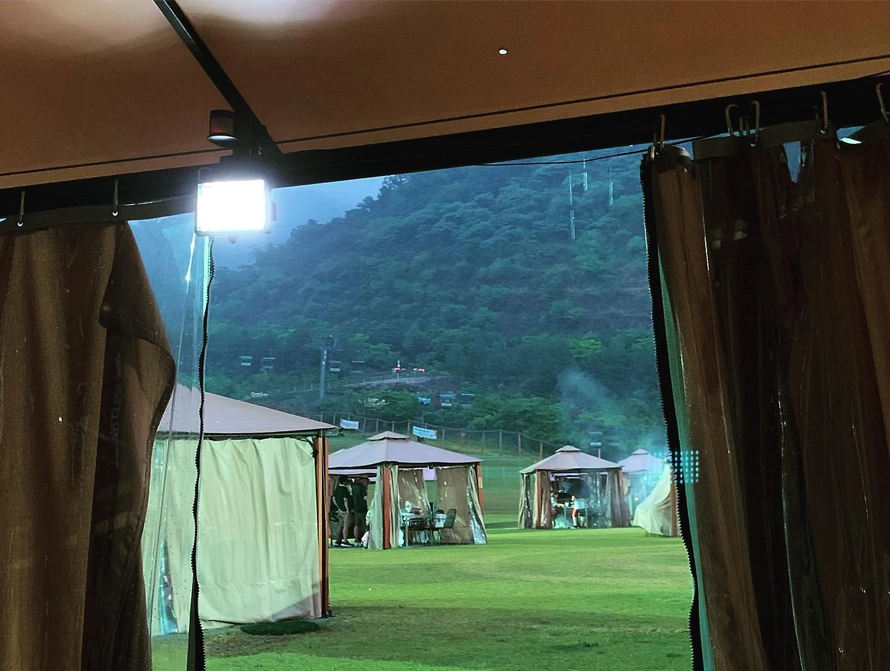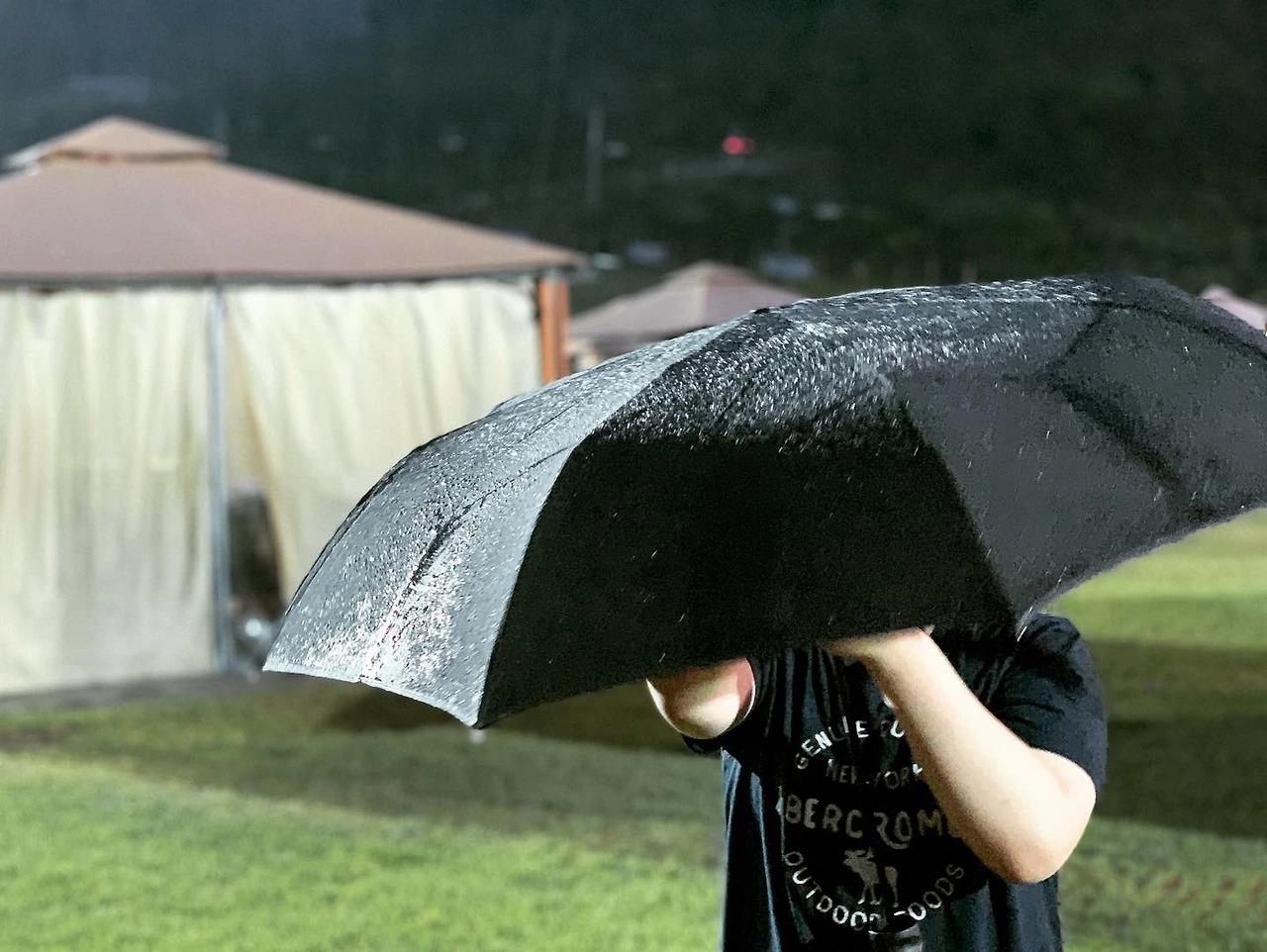 처음엔 봄비처럼 오더니 점점 빗소리가 거세진다. 야외 텐트를 두드리는 빗소리가 싫지 않다.