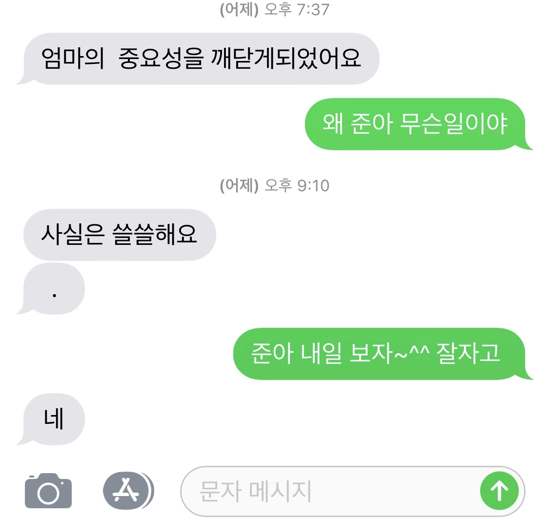 단 하루뿐인 엄마가 없는 날, 엄마의 빈자리를 많이 느꼈다는 문자에 그저 사랑스럽고 행복한 기분이 든다.