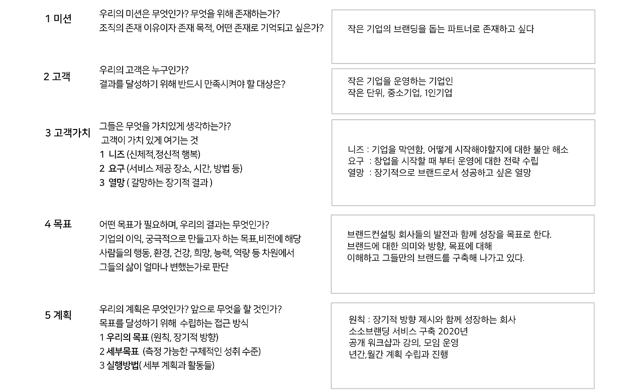 그가 아이기하는 다섯 가지 질문을 중심으로 브랜드를 시작하는 창업가를 위한 질문과 답을 위한 시트로 구성해 보았다. 결과 항목은 목표로 변경하였다.