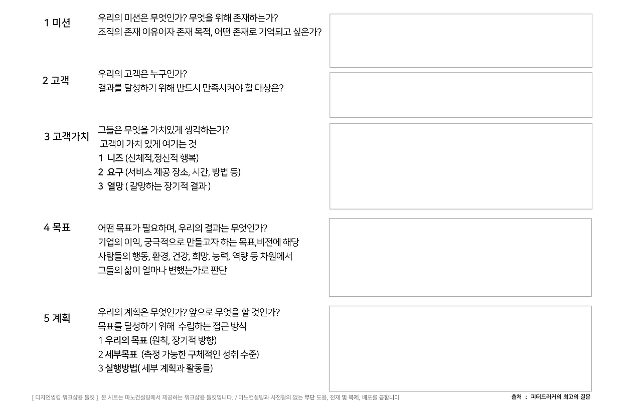 짧지만 명확한 다섯가지 질문은 기업을 준비하고 있거나 기업을 운영하고 있는 명확하게 정리를 할 수 있는 질문서이다.