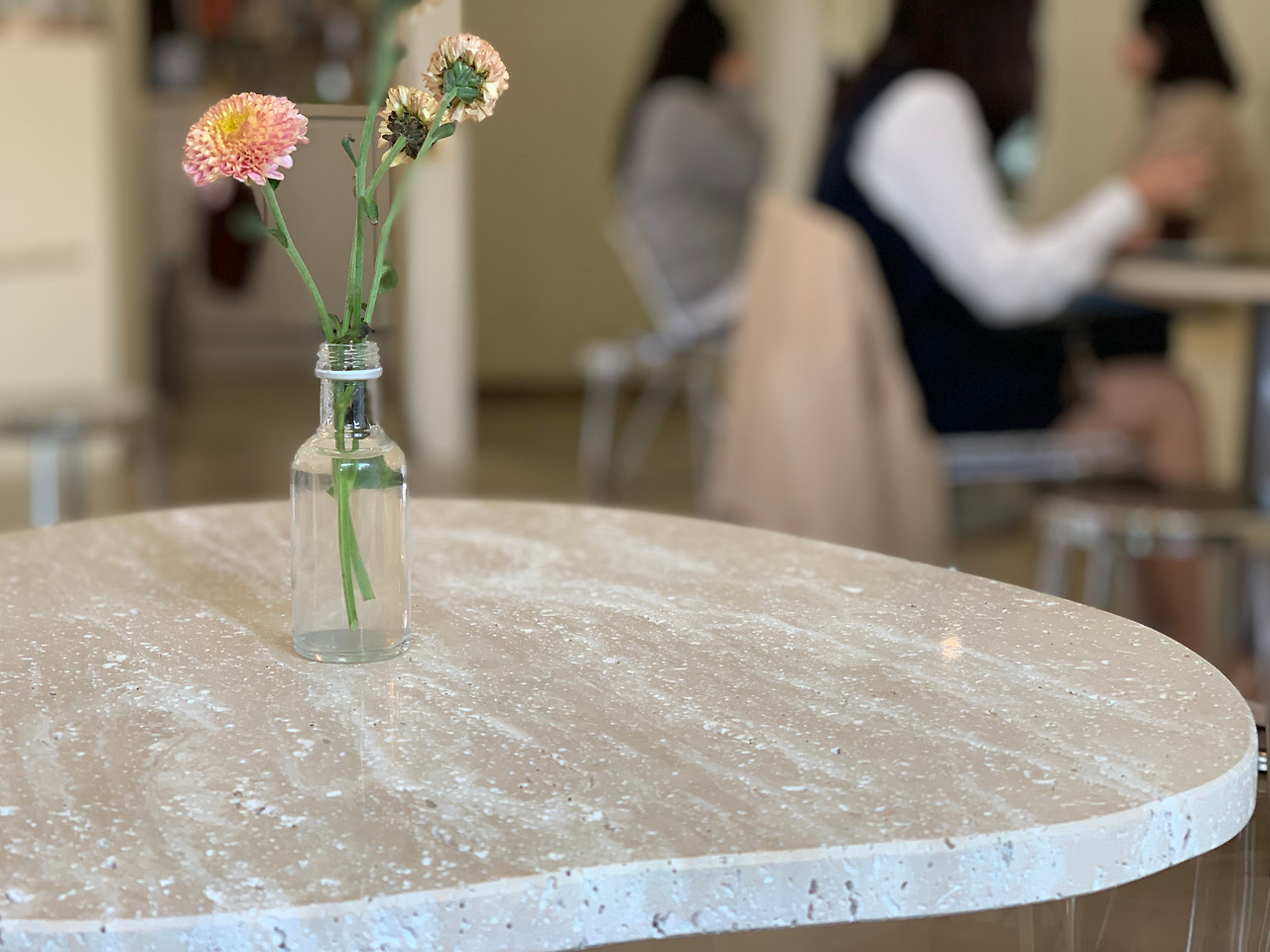 거친 느낌의 현무암 느낌의 티테이블과 스탠의자가 인테리어 가구의 전부이지만 공간의 미니멀함을 살려주는 소재의 변화와 컬러의 조화가 좋습니다.