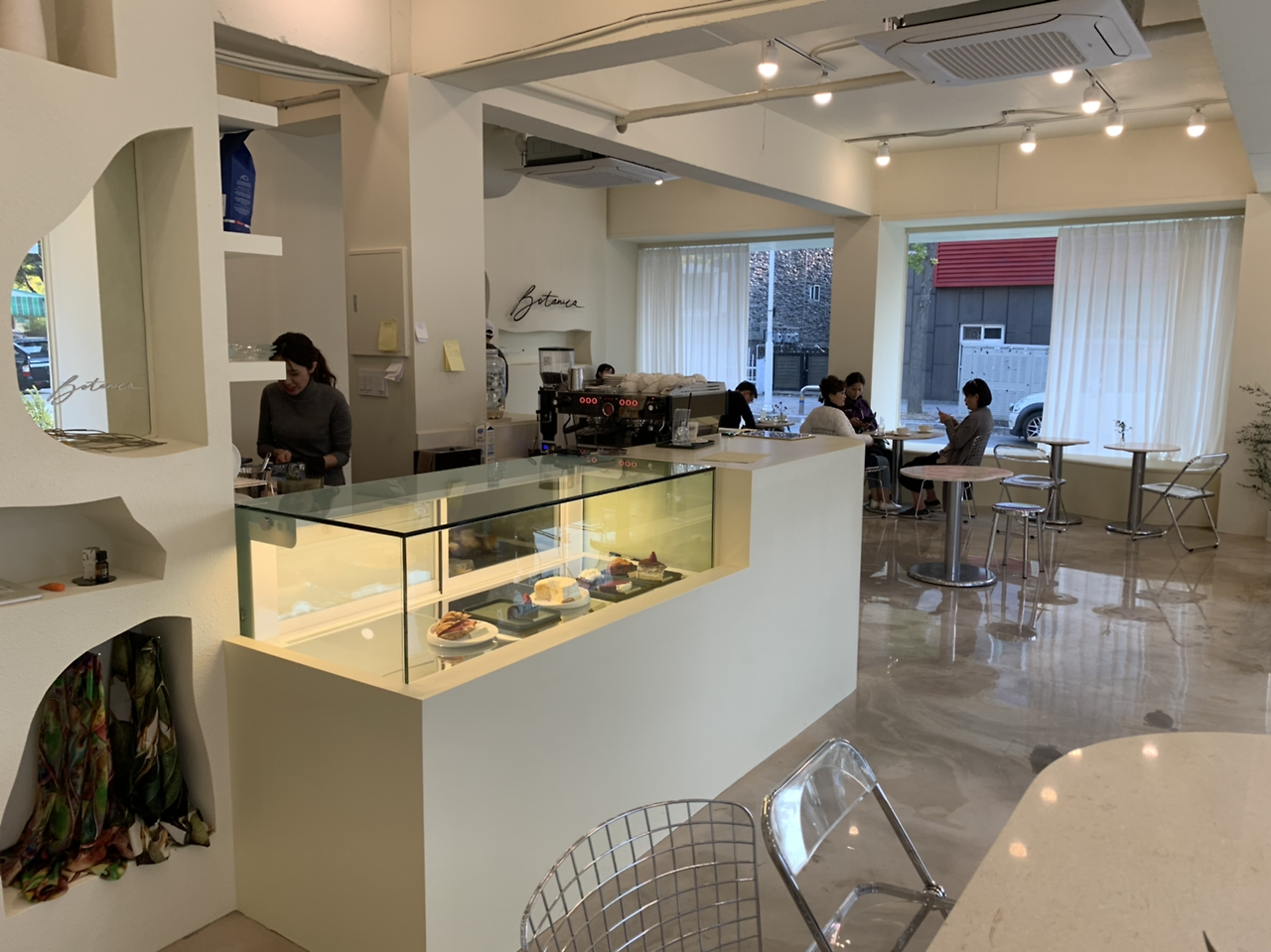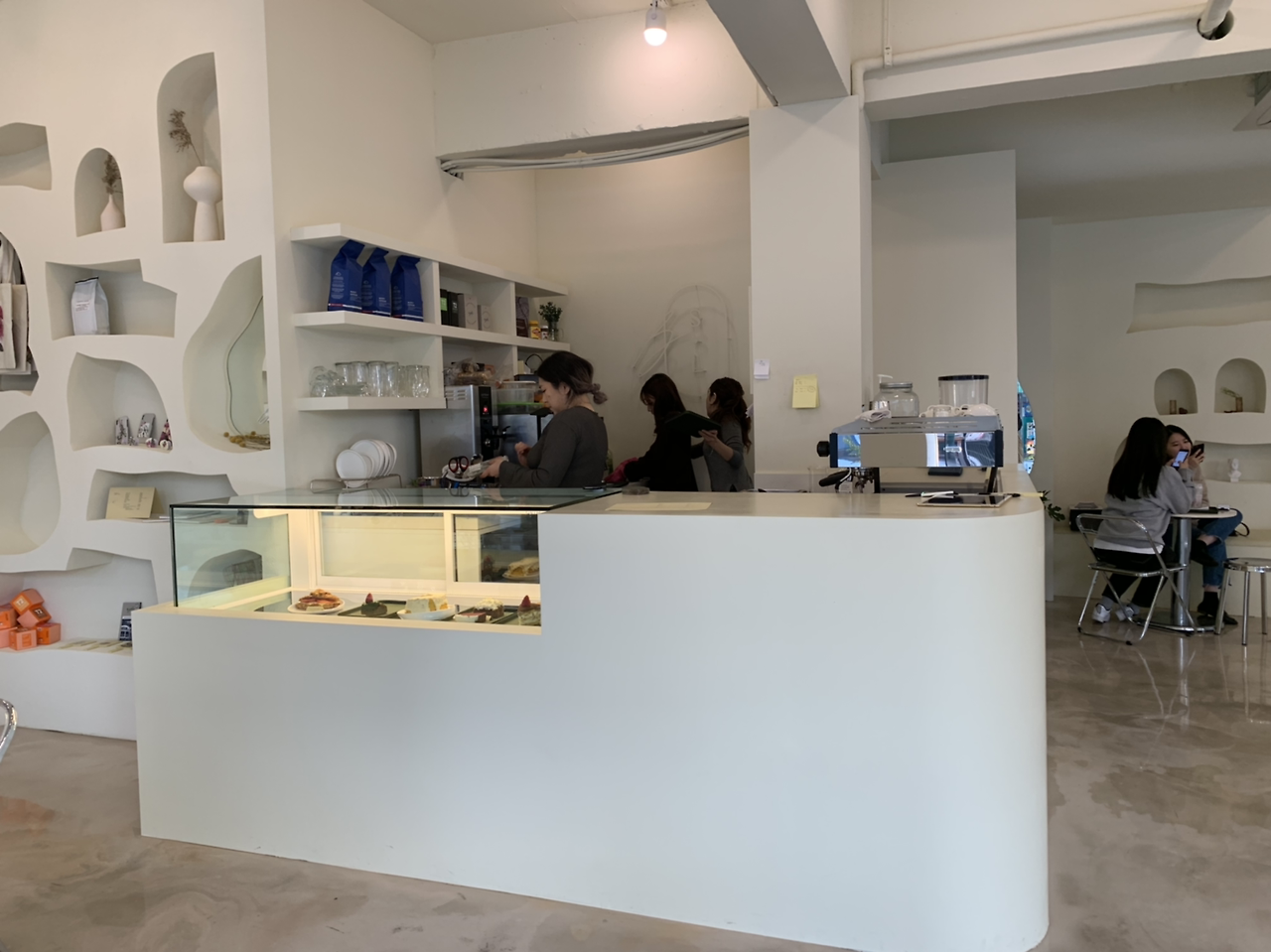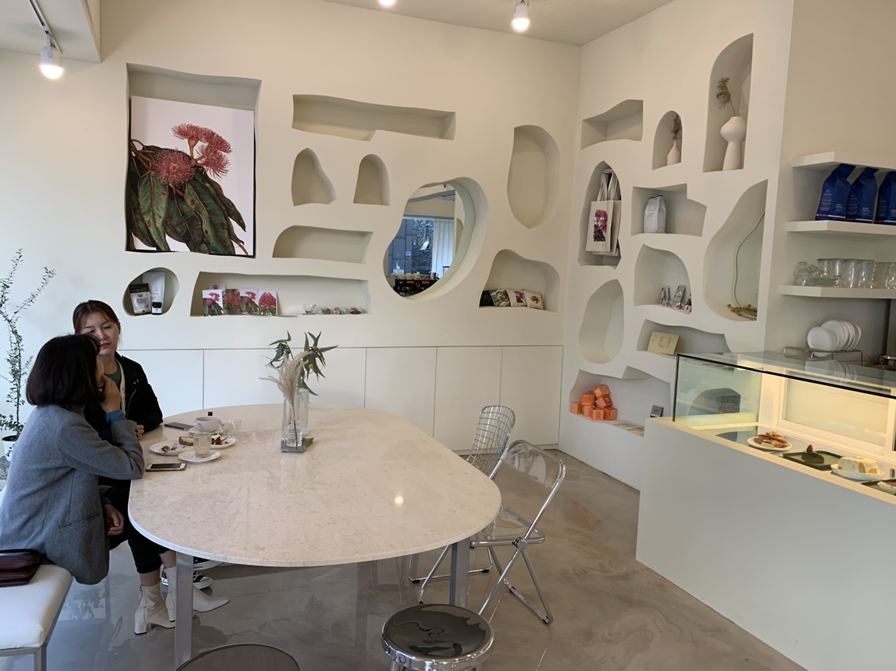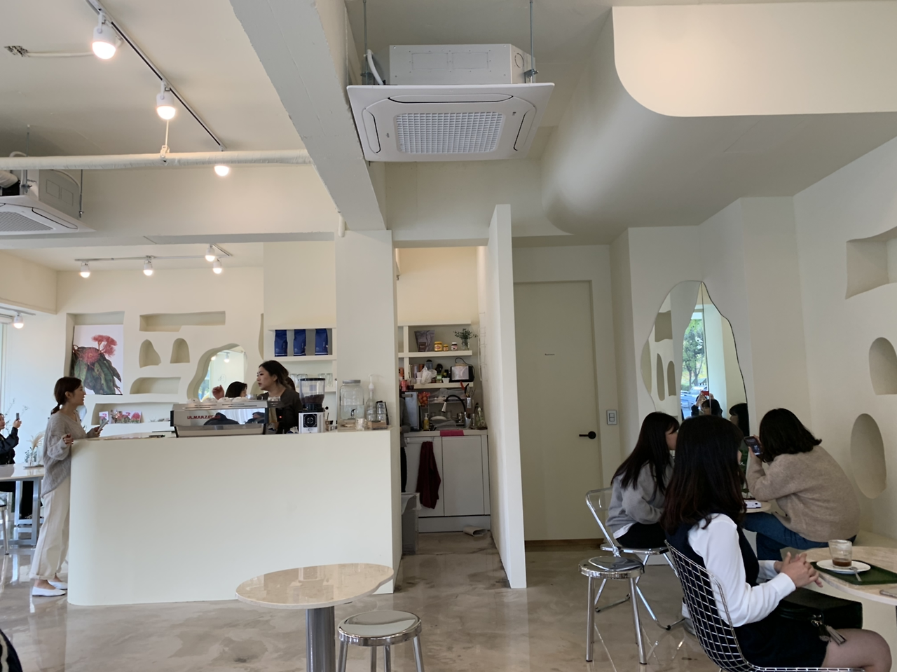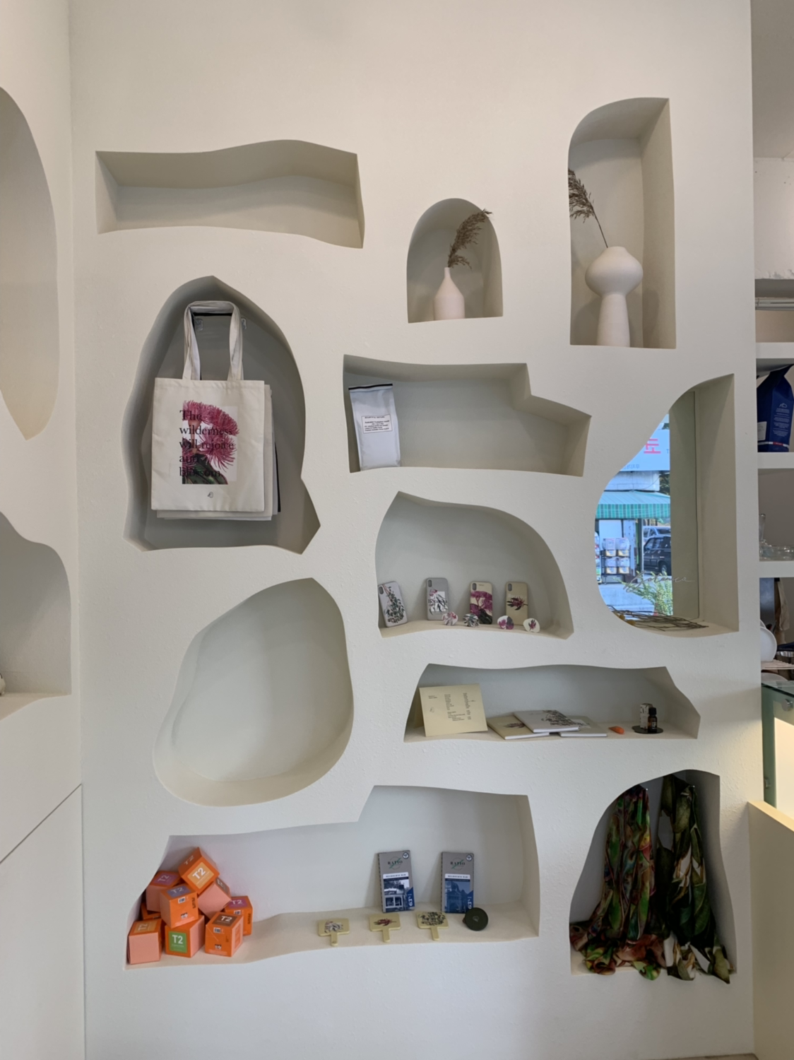 내부에는 직접 판매하는 제품도 디피되어 있는데, 벽면의 불규칙한 형태의 디스플레이 공간의 조성과 활용도 자칫 밋밋해보일 수 있는 공간의 재미를 더해줍니다.