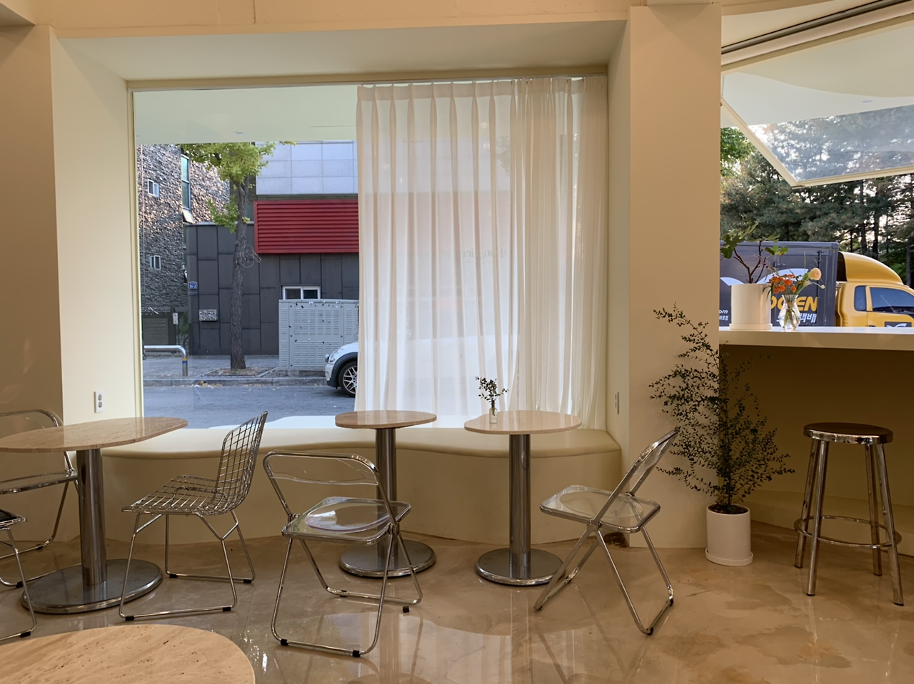 내부로 들어서면 벽을 타고 흐르는 듯 조성된 테이블과 의자의 배치가 공간을 하나로 엮어주는 느낌이네요.