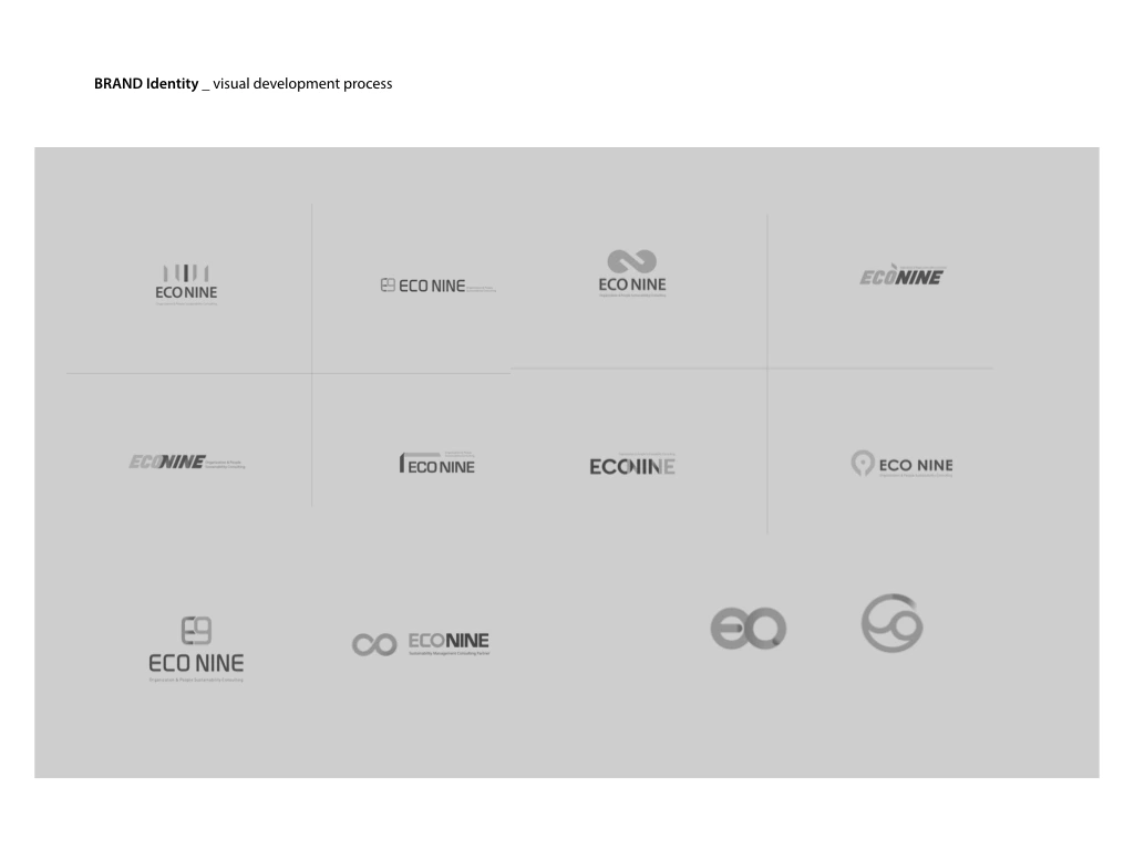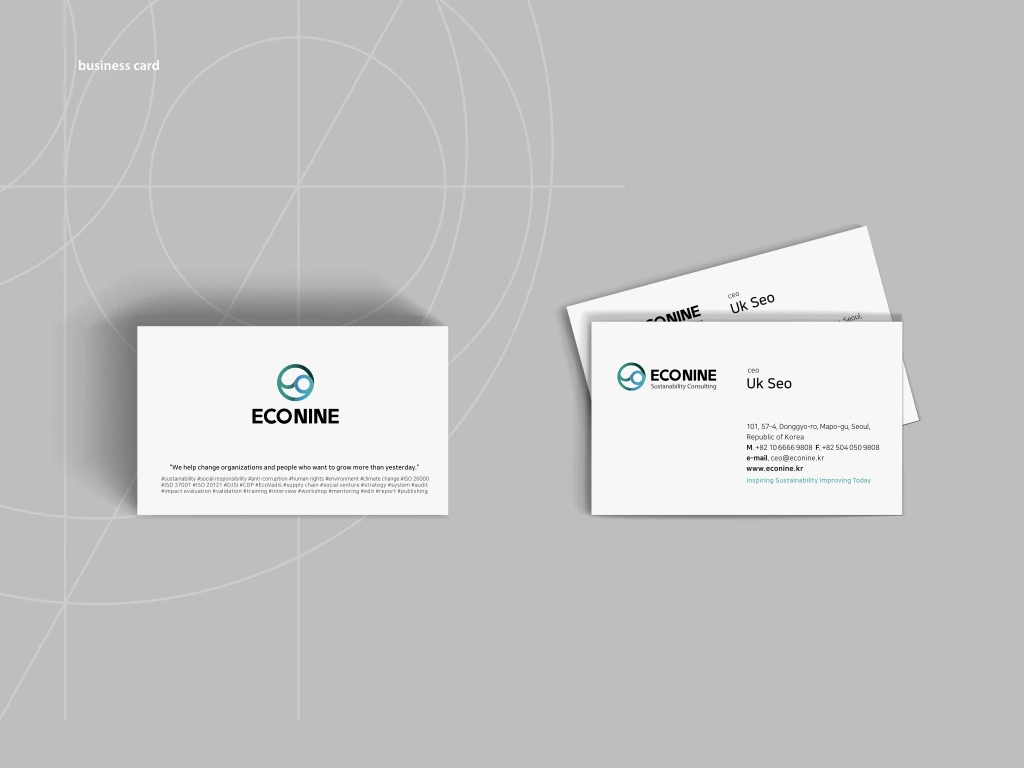 지속가능 경영은 경제, 사회, 환경이라는 3대 축으로 이루어져 있습니다. 전지구의 지속가능성을 생각하면 가장 떠올리지 쉬운 분야가 '홪경'이며, 지속가능성을 추구하는 개인과 조직의 시작을 돕는 에코 나인의 브랜드 적 가치를 나타낼 수 있도록 네이밍과 심벌디자인을 규정하였습니다.