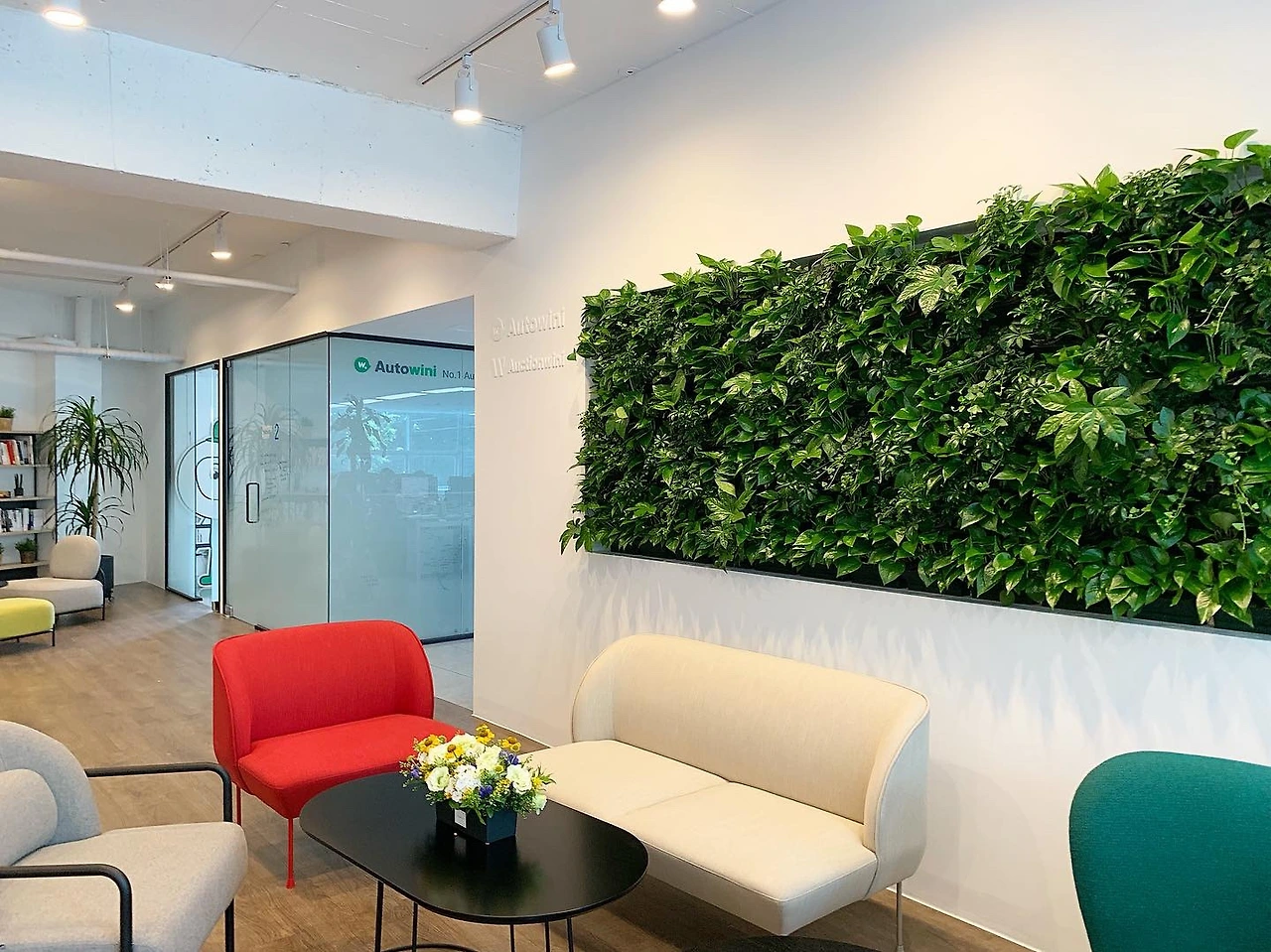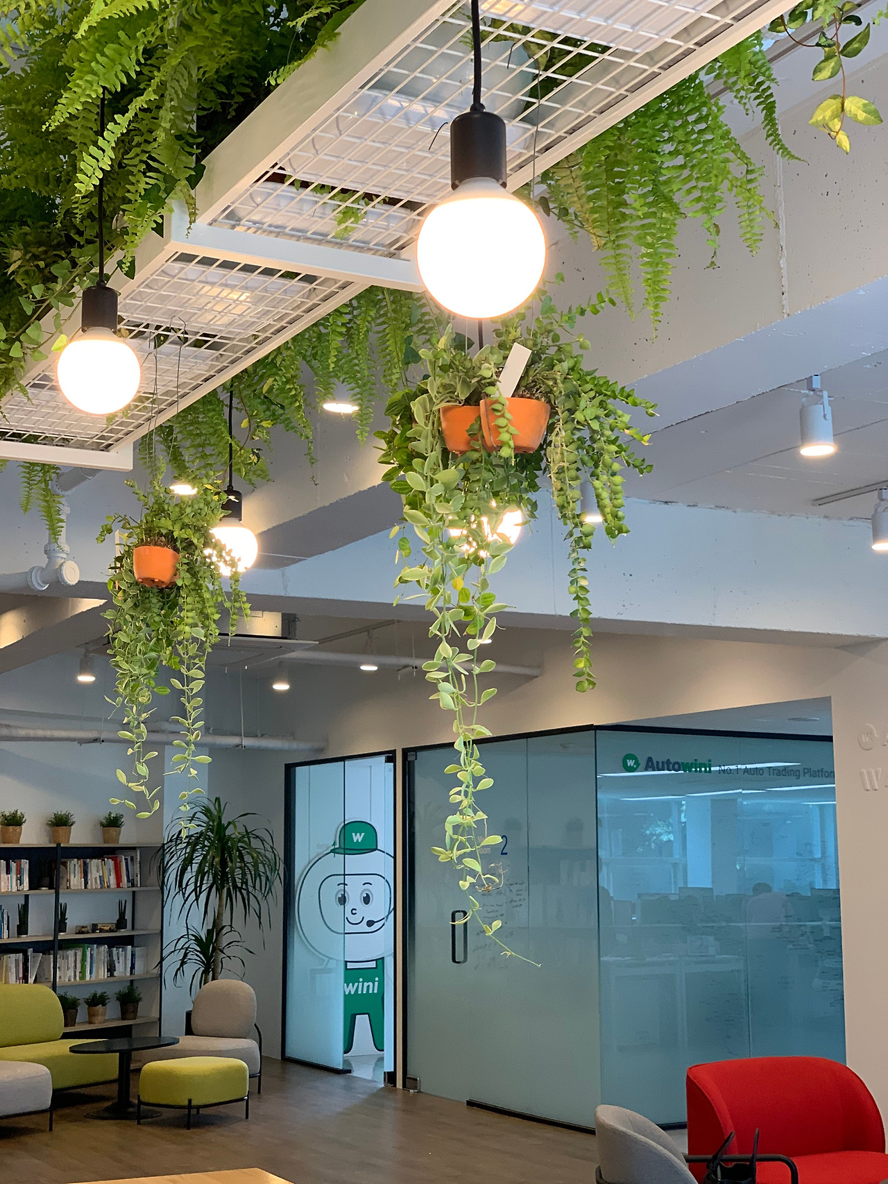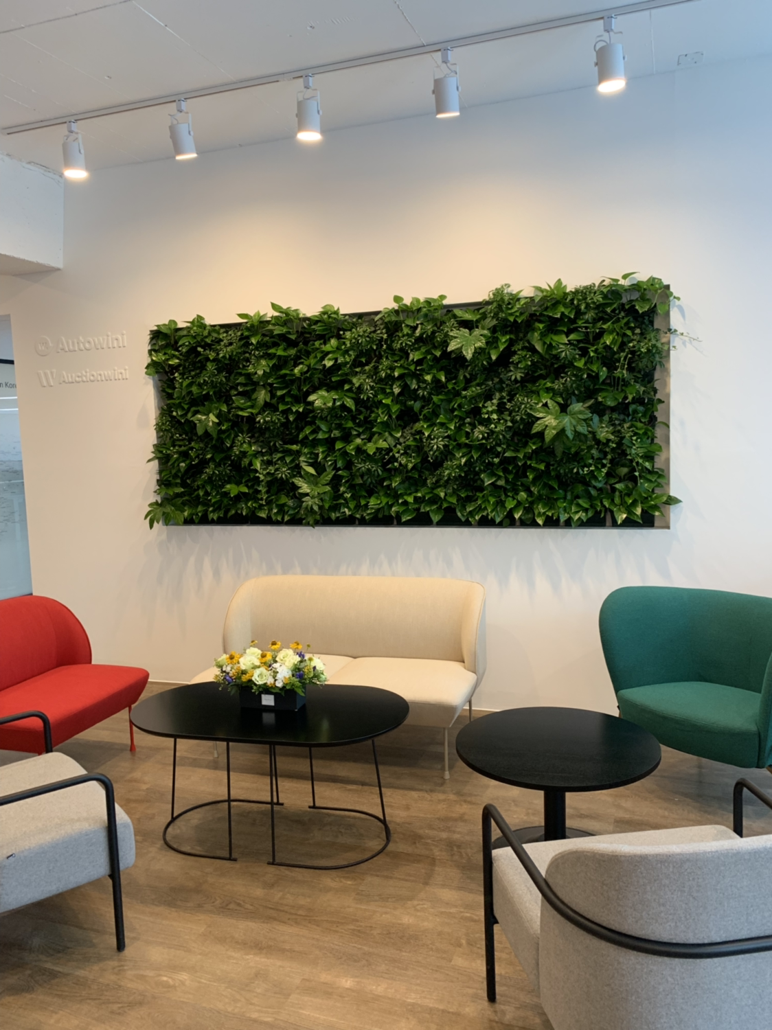 생화로 진행한 플랜테리어는 대표님이 담고자하는 재사용,재활용 친환경 미션을 담은 브랜드 서비스의미도 전달하는 요소로 공간을 이루는 좋은 매개체이며 초록 초록한 오토위니 브랜드 컬러와도 잘 어우러지는 소재다.