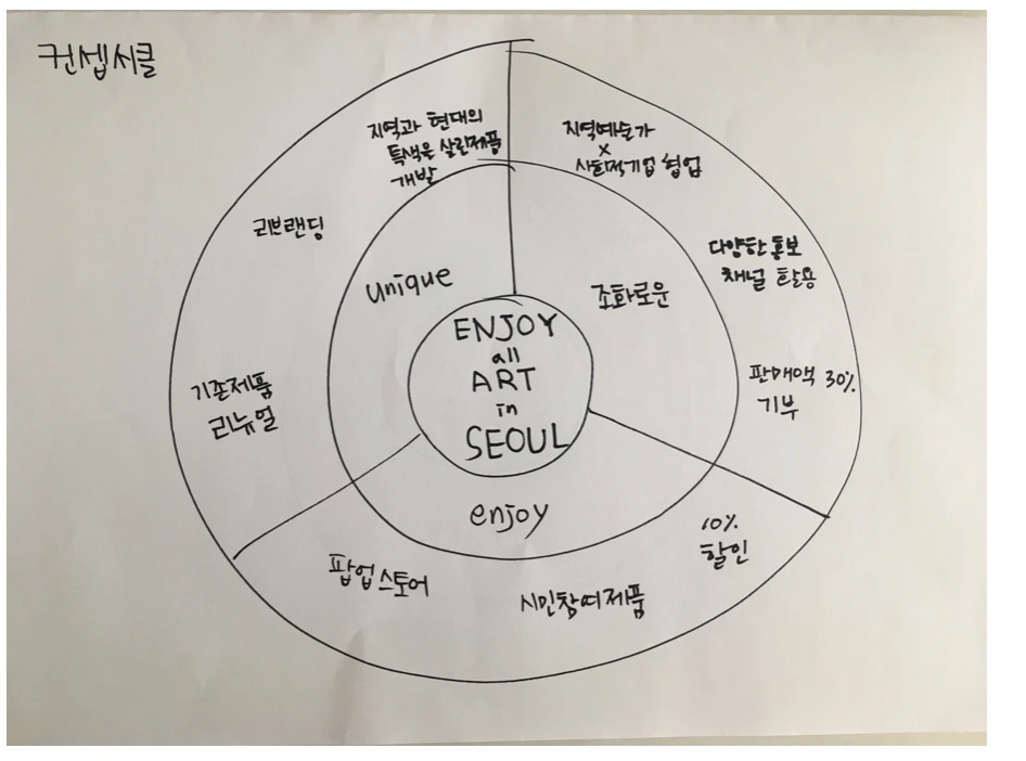 우리의 프로젝트를 한마디로 말할 수 있는 콘셉트로 정리해보자. 선정된 아이디어들을 중심으로 우리의 아이디어들의 콘셉트는 한마디로 우리의 아이디어를 설명할 수 있는 문장이다.