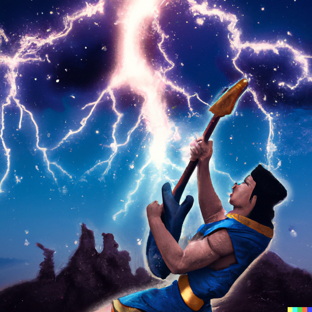 입력 text: Zeus playing electric guitar, with lightings in the sky