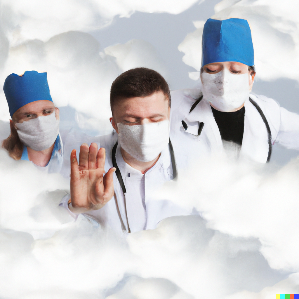 입력 text: Doctors with masks flying through the clouds