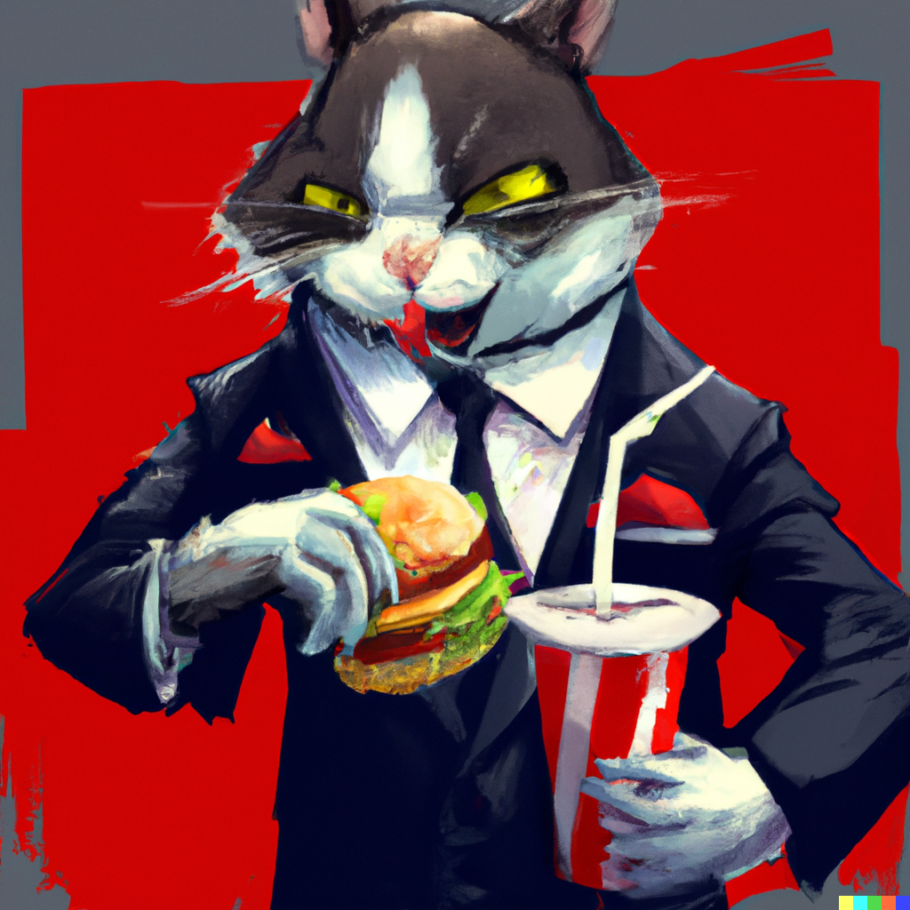 입력 text: A cat wearing a suit eating a burger, fries and coke, digital art