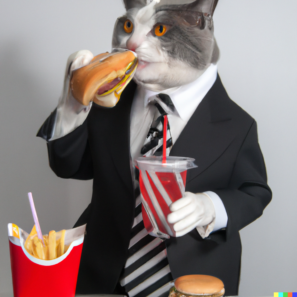 입력 text: A cat wearing a suit eating a burger, fries and coke