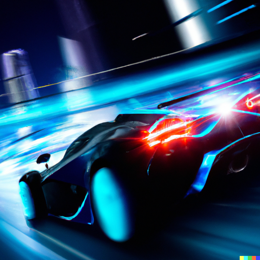 입력 text: Super car in midnight blue, driving down the metropolitan area full of neon lights