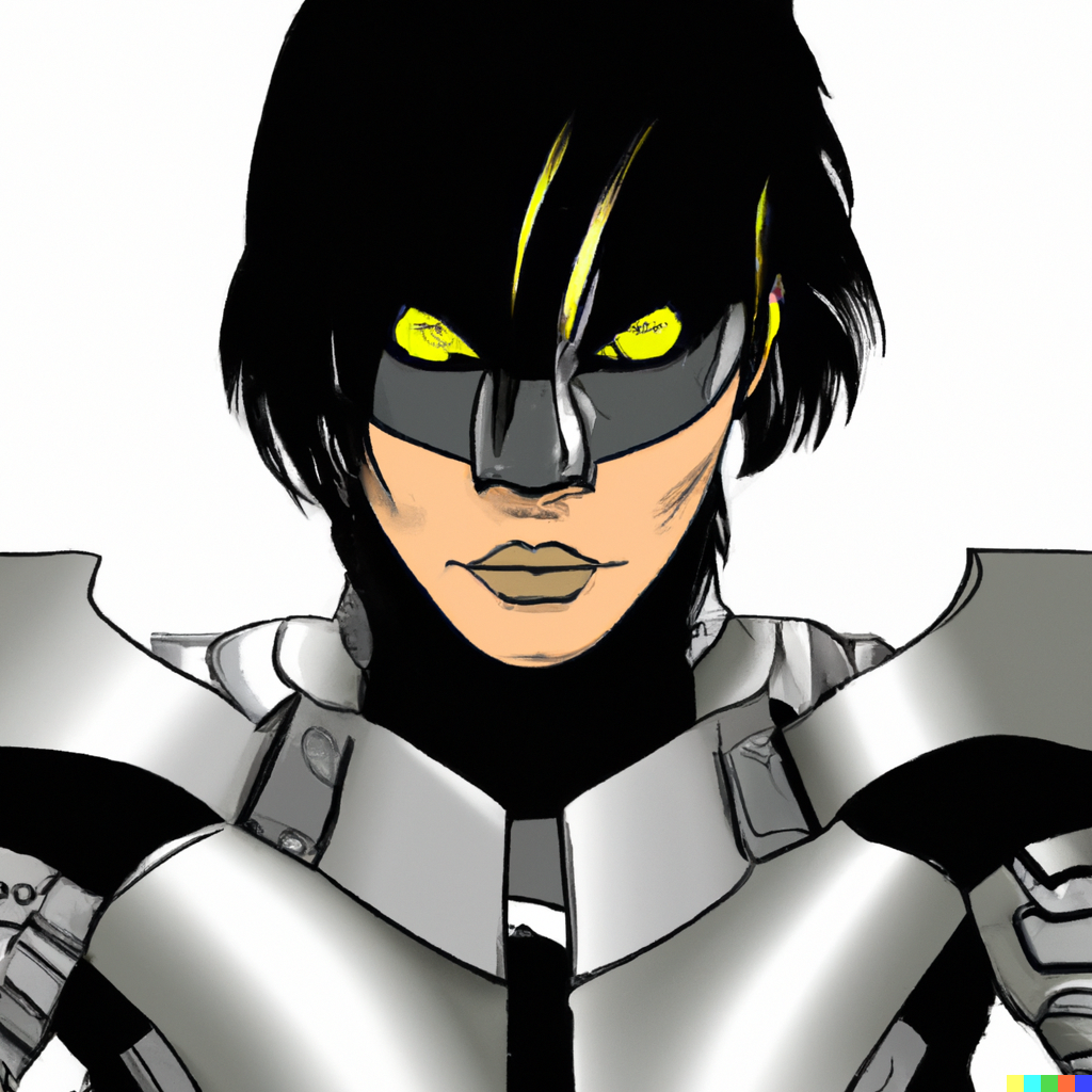 입력 text: A comic book cover of a female superhero in a suit of metal armor with short black hair and wearing a mask