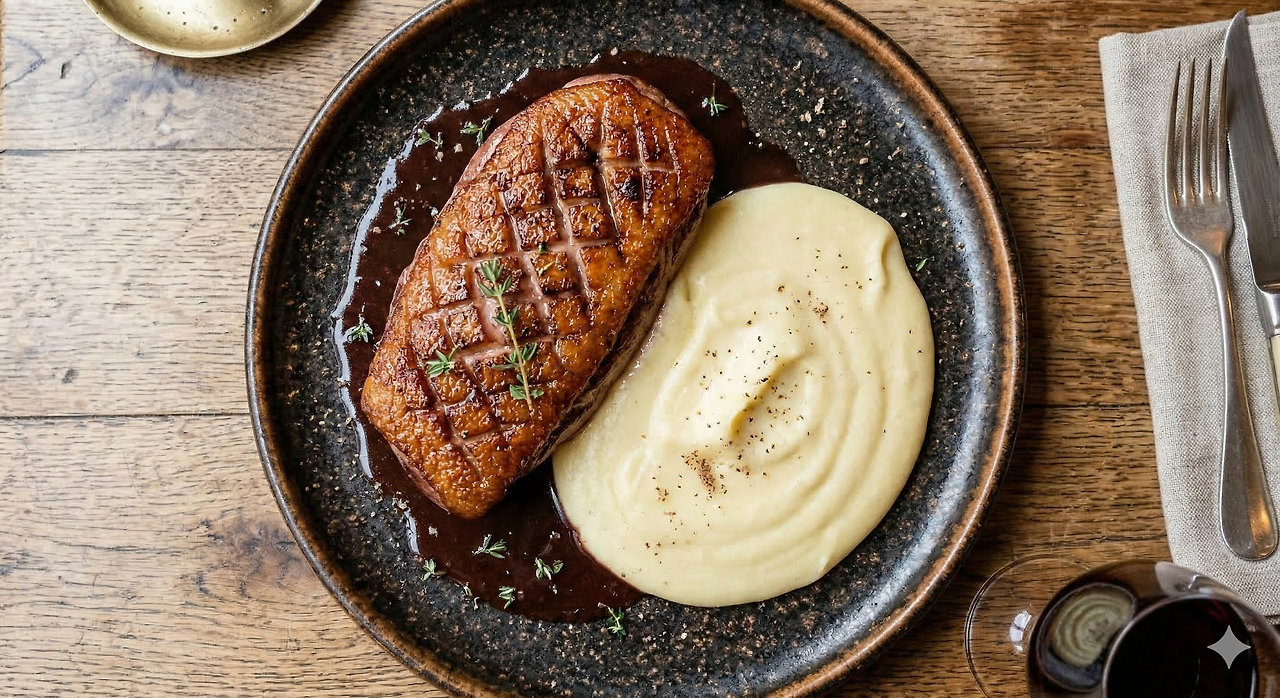 *마그레 드 까나흐(Magret de canard): 푸아그라를 만들기 위해 키운 오리의 가슴살을 마그레라고 부름. 그 마그레를 스테이크처럼 조리한 것으로 육질이 진하고 풍미가 강한 것이 특징임. 껍질아래 두껍고 고소한 지방층이 형성되어 있어 잘 조리한 경우 겉바속촉함. 보통 로제라고 하여 레어 같은 상태로 먹는 것이 일반적임. 단맛이 나는 소스를 같이 곁들여 먹는 경우가 많음.