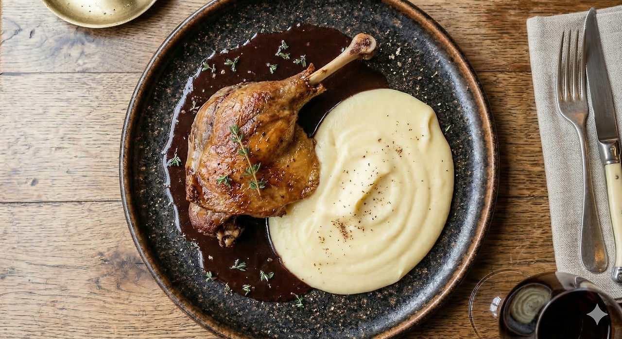 *콩피 드 캬나흐 (Confit de canard): 오리기름 속에 오리 다리를 넣고 낮은 온도에서 천천히 익힌 뒤 오븐에 다시 바삭하게 구워낸 요리. 오랜 시간 기름에 익혔기 때문에 살결이 결결이 찢어지는 부드러우며 겉은 다시 바삭하게 구워 냈으므로 잘 조리했을 경우 겉바속촉의 정석임.