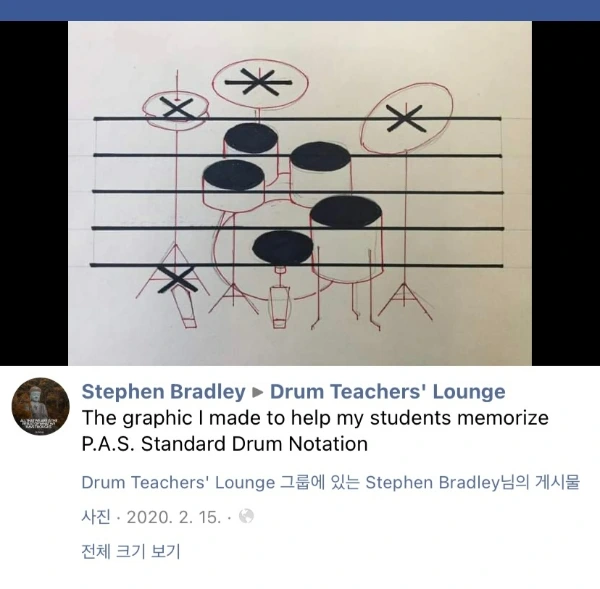Stephen Bradley라는 한 드럼 교사가 그 주인공이다. 그는 페이스북에 자신이 가르치는 학생들을 위해 만든 드럼 기호 외우는 방법을 직접 그려 올렸다. 드럼 셋의 모습을 그대로 오선지에 옮기고, 각 탐과 심벌의 높이를 음표 위치에 맞추어 기호와 함께 그린 것이다. 이 그림을 통해 드럼 악보 읽는 법을 한눈에 이해할 수 있다! 해당 게시물은 9,500번 이상 공유되며 큰 호응을 얻었다.