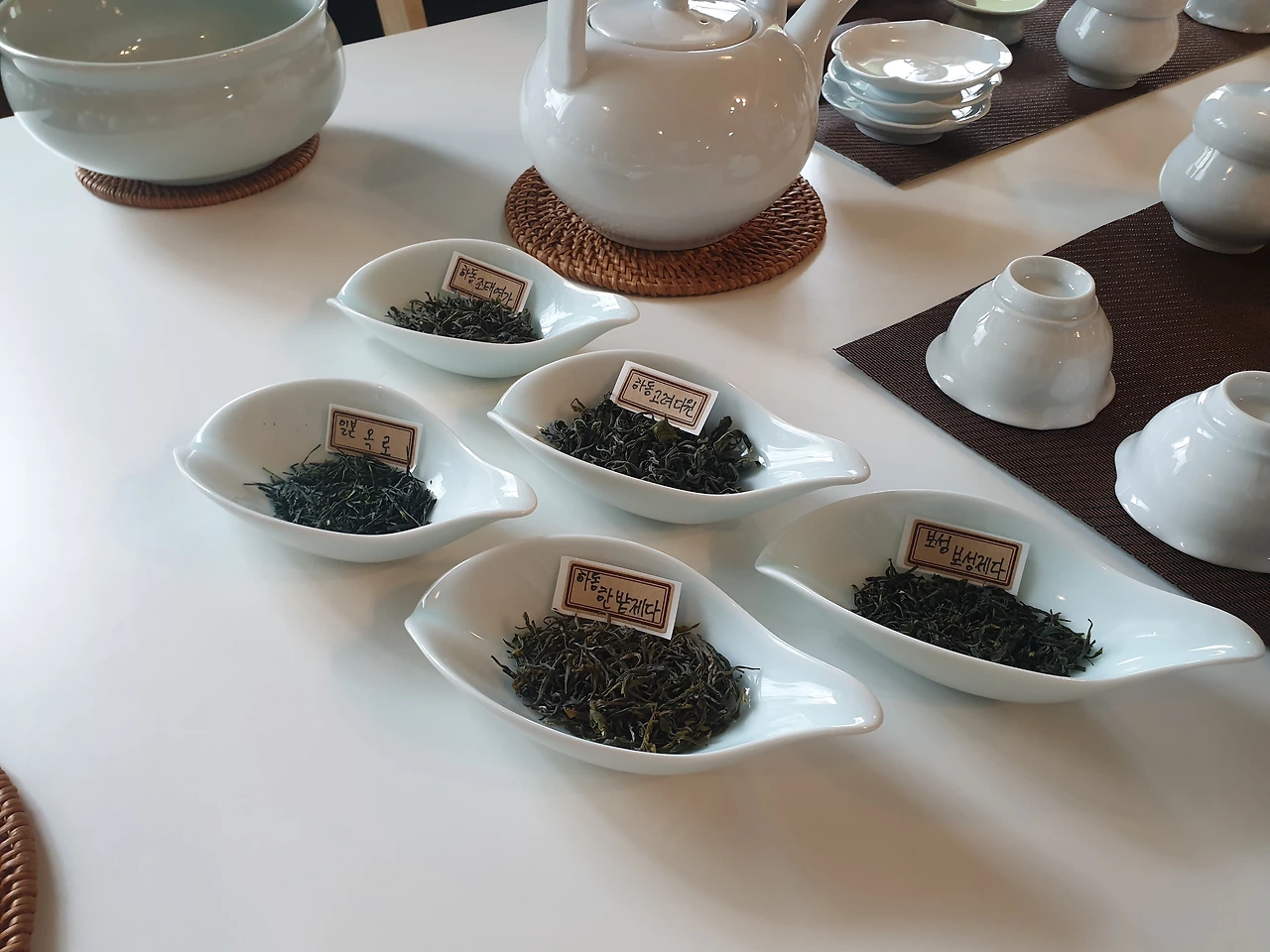 "자, 오늘은 보성의 보성제다, 하동의 한밭제다, 고려다원, 조태연가 녹차 그리고 일본의 옥로와 센차를 직접 우려 봅시다."