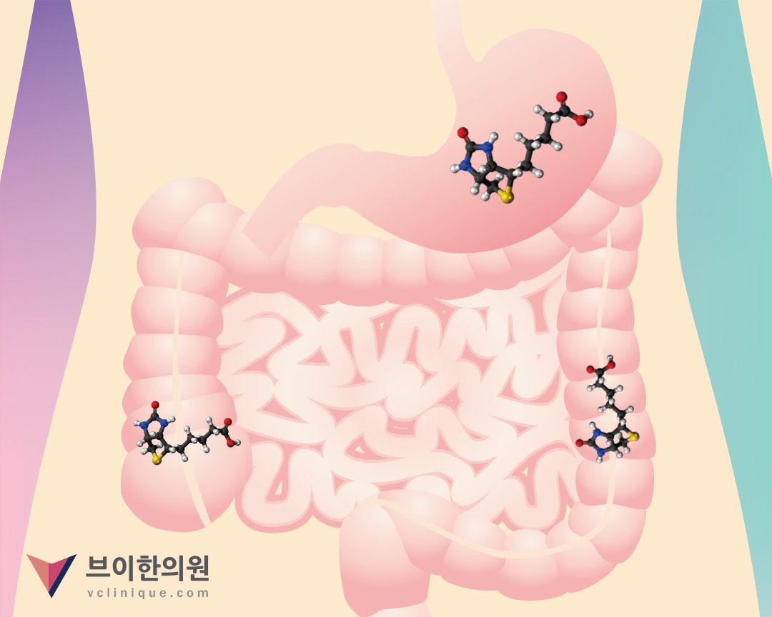 판토텐산과 비오틴은 소장과 대장에서 같은 경로로 흡수됩니다. 이 두 영양소는 경쟁적으로 장점막의 비타민 수용체와 결합해서 체내에 흡수되는데, 만약 둘 중 하나가 많이 흡수될 경우, 다른 하나는 결합할 수용체가 부족해서 체내에 흡수되지 못하고, 결핍증을 유발하게 됩니다.