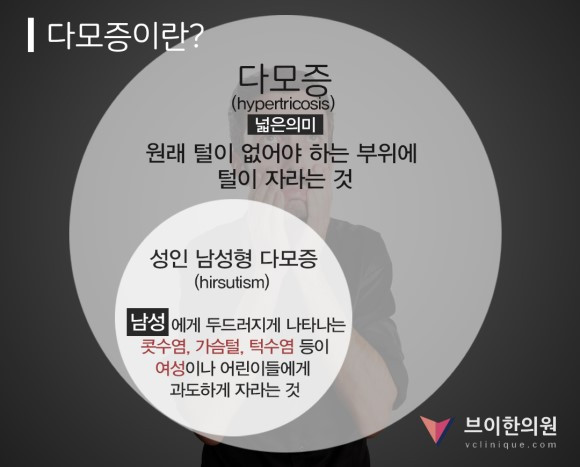 좁은 의미에서 남성 호르몬의 영향을 받지 않는 부위의 피부 털이 과도하게 자라는 것을 의미하지만, 넓은 의미에서는 남성 호르몬(안드로겐)과 연관된 성인 남성형 다모증(hirsutism)을 포함하는 개념입니다. 성인 남성형 다모증(hirsutism)은 남성에게 두드러지게 나타나는 콧수염, 가슴털, 턱수염 등이 여성이나 어린이들에게도 과도하게 자라는 것을 말합니다.