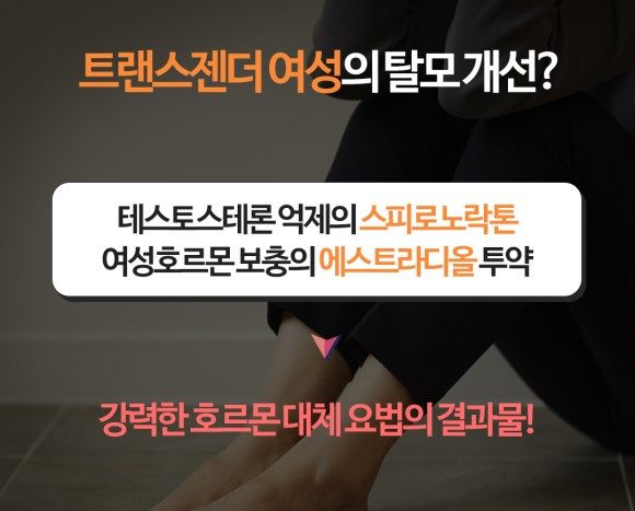 이런 사례들을 보건대 성전환 수술의 여부가 남성이나 남성에서 여성으로 성전환 수술을 한 트랜스젠더 여성의 탈모에는 크게 영향이 없음을 알 수 있습니다. 오히려 호르몬 대체 요법을 어떻게 했느냐가 더욱 핵심적인 부분입니다. 지난 [브이한의원 탈모칼럼22편_알닥톤, 스피로노락톤 바로알기]에서 알려드렸듯이 스피로노락톤은 남성 호르몬 테스토스테론이 인체에 작용하는 것을 억제하므로 트랜스젠더 여성의 호르몬 대체 요법에 자주 사용되는 약입니다. 성전환 수술을 받지 않고 호르몬 대체요법으로 신체여성화와 함께 탈모가 개선된 사진의 주인공이 어떤 약으로 호르몬 대체 요법을 시행했는지는 확실하지 않지만 SNS를 통해서 테스토스테론을 억제하는 약과 에스트로겐, 프로게스테론을 보충하는 약을 함께 복용하고 있음을 밝혔습니다. 확실하진 않지만 이 경우도 2016년 트랜스젠더 여성의 남성형 유전성 탈모에 사용한 스피로노락톤에스트라디올 복합 처방을 복용했을 가능성이 매우 높습니다. 스피로노락톤으로 테스토스테론의 작용 및 생성을 원천적으로 차단하면서, 여성호르몬인 에스트라디올을 투여하는 호르몬 대체 요법은 매우 강력하게 혈중의 남성 호르몬과 여성호르몬 농도를 조정합니다. 트랜스젠더 여성에게 있어서의 탈모개선은 이런 강력한 호르몬 대체 요법의 결과물이지 성전환 수술의 결과물이라고 보기에는 무리가 있습니다.