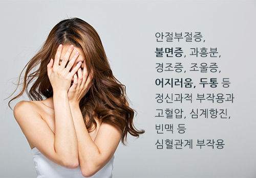 안절부절증, 불면증, 과흥분, 경조증, 조울증, 어지러움, 두통 등 정신과적 부작용과 고혈압, 심계항진, 빈맥 등 심혈관계 부작용을 일으키기 쉽습니다.