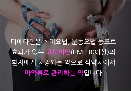 본래 디에타민은 식이요법, 운동요법 등으로 효과가 없는고도비만(BMI 30이상)의 환자에게 처방되는 약으로, 다른 식욕억제제와 병용하지 않고 단독으로 사용하는 것으로, 단기간(4주이내) 보조적으로 사용하고 최대 12주 이상 복용하지 않도록 명시되어 있는, 식약처에서 마약류로 관리하는 약입니다.