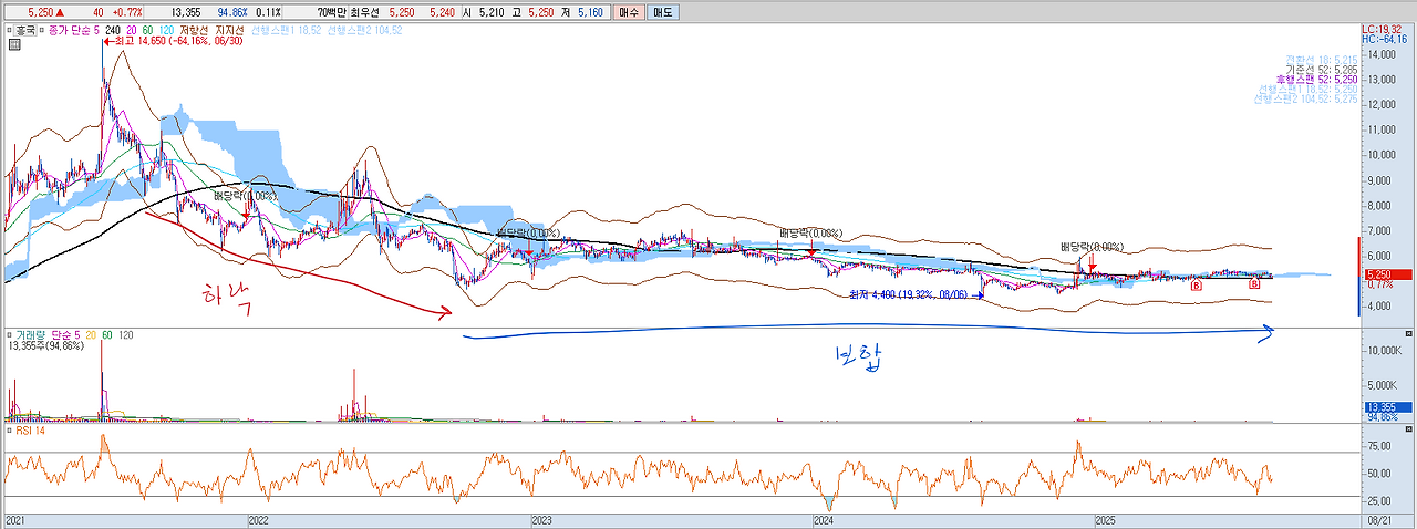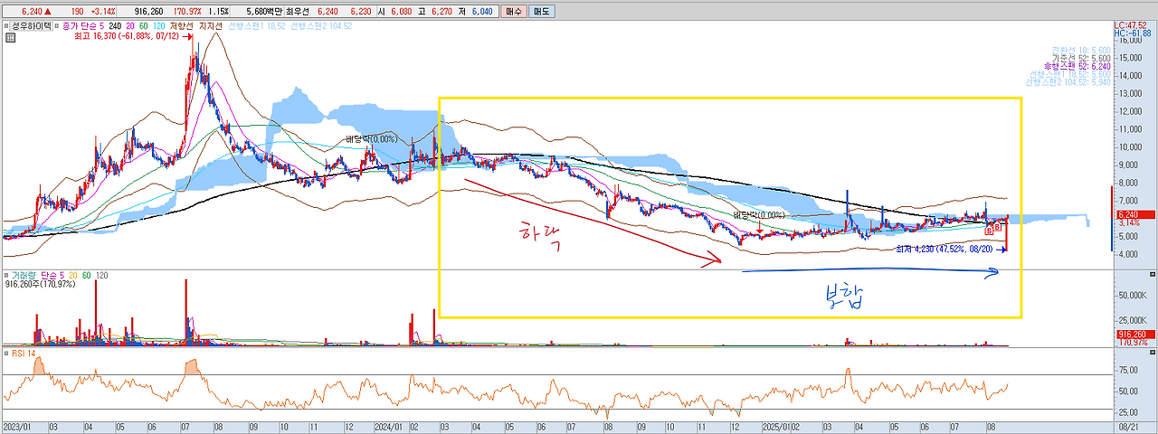 먼저, '24.12월 경, RSI 보조지표가 과매도를 나타냅니다. 단기간에 많이 하락했을 때만 나옵니다. 이후에 주가는 하락세를 멈추고 5,000원선에서 보합세를 보이며 점차 상승합니다. 20일, 60일 이평선도 모두 올라타서 지지하는 모습을 보입니다.