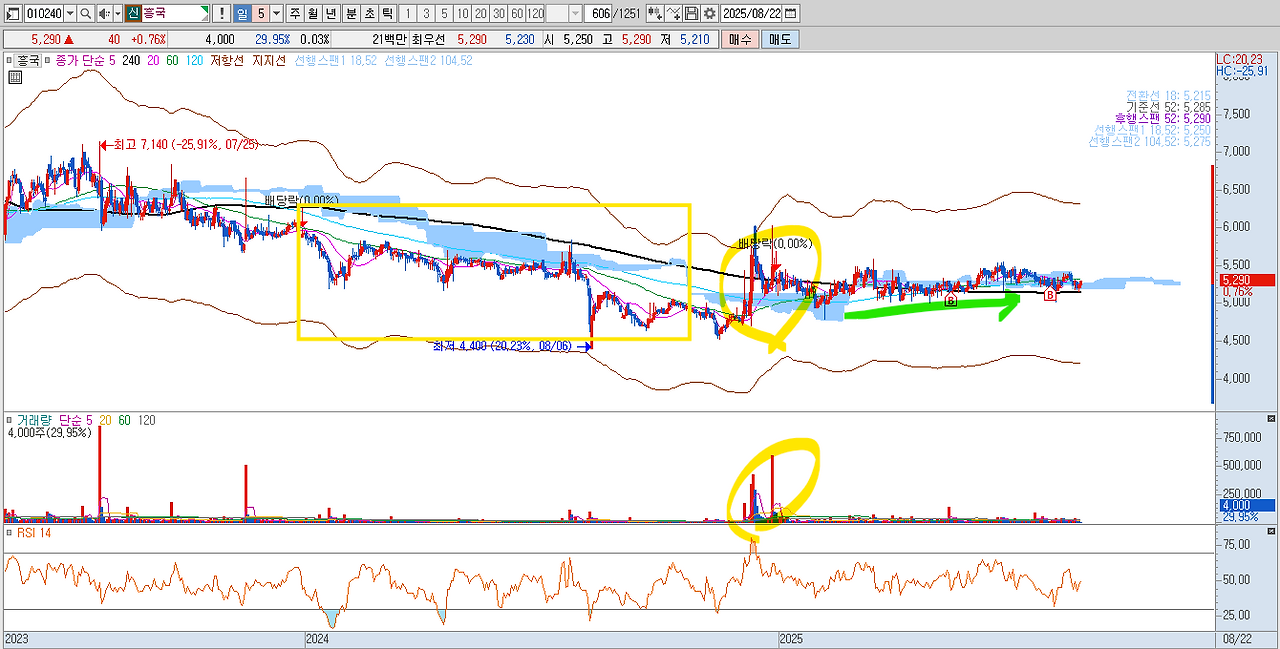 위에 또 다른 예시인 흥국의 일봉 차트도 마찬가지입니다. 주가 하락세가 계속되다가 '24.12월에 기존 매물대 구간을 찌르는 거래량을 동반한 장대 양봉, 음봉 캔들이 나옵니다. 이후 하락세를 멈추고 추세가 바뀌어 240일 이평선을 타고 6개월간 옆으로 흐르네요. 단지 추세가 변경된 것이 아니라, 돈이 들어오는 모습이 보인 후 추세가 바뀌고 새로운 지지라인이 형성된 것이 중요한 포인트입니다. 의도적인 힘에 의해 추세가 변경되었다고 저는 해석됩니다.