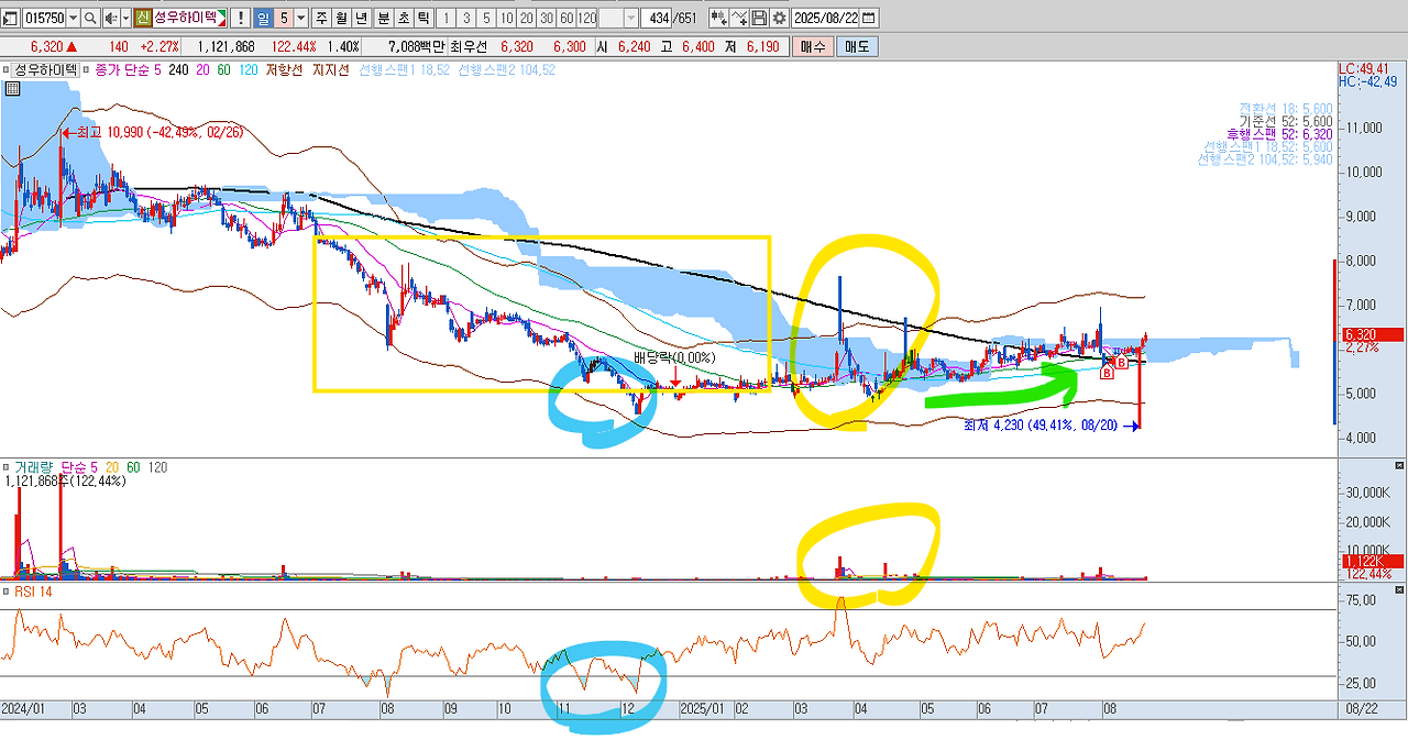 1) 장기 이동평균선(이평선) 역배열, 240일(1년) 이평선 근처