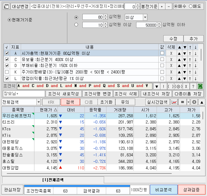 조건을 더 보수적으로 설정하면 검색되는 종목 숫자는 줄어듭니다만 다른 조건은 좋은데 특정 값이 조금 모자라 탈락되는 종목을 고려하여 이 정도 숫자가 검색되도록 사용하고 있습니다.