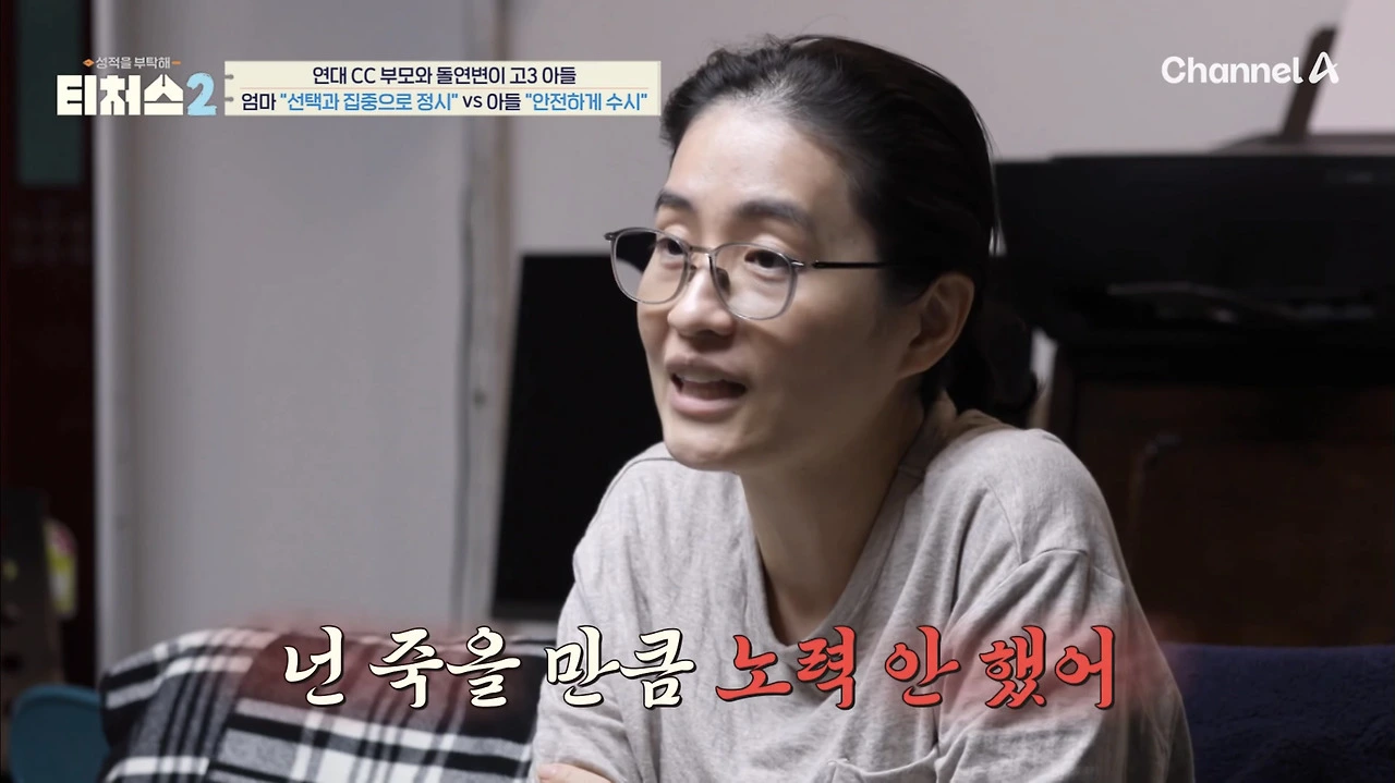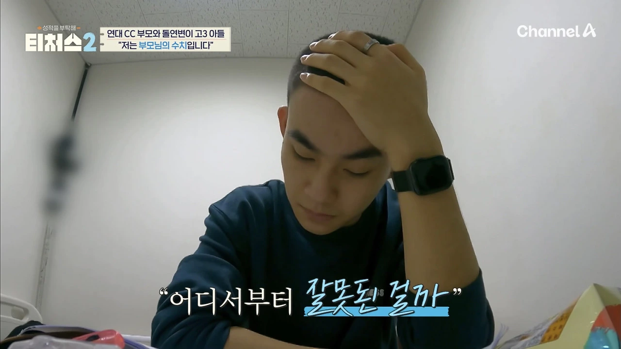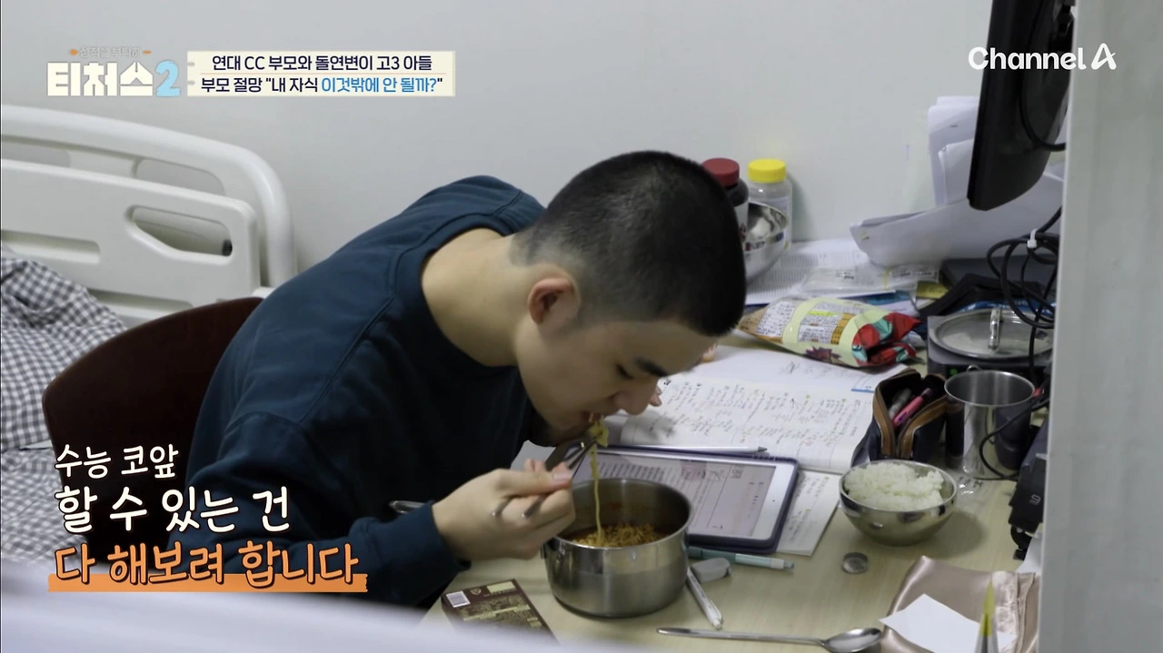 세찬이는 학교, 학원에 이동하는 시간을 줄이기 위해 고시원 생활을 하고 있습니다. 이런 세찬이에게 노력을 하지 않는다고 할 수 있을까요? 영상에서 처럼 세찬이도 최선을 다해 공부하고 있었습니다. 심지어 라면을 먹으면서도 수학 문제를 풀고 있었죠. 그럼에도 불구하고 성적이 낮은 이유는 엄마의 높은 불안과 할 말은 하는 엄마의 성향 때문이에요.