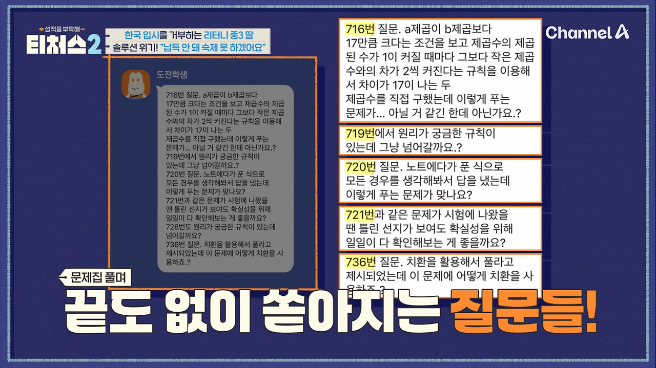 발전 욕심이 있는 불의 성향의 사람들은 존경할 수 있는 대상, 배울 점이 많은 대상을 좋아합니다. 이런 특성으로 인해 수학 1타 선생님인 정승제 선생님의 말에는 귀를 열고, 시키는 대로 잘 따라 했던 것이죠. 정승제 선생의 끈질긴 설득과 노력 끝에 가온이는 수학 공부에 집중할 수 있었고, 수학의 재미를 알아가기 시작했습니다. 거기에 더해, 매일 카톡으로 꼼꼼하게 가온이의 질문에 답을 해준 것도 솔루션이 거의 성공할 뻔한 주요한 원인이었습니다.