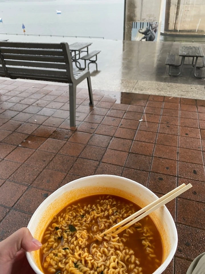 조금 배가 고프긴 한데 그렇다고 비 맞으며 라면을 먹는 건 조금 아니라고 생각했다. 하지만 허기만 달래자고 들어간 편의점에서 반짝이는 라면을 보니 기왕 비 오는 날에 온 거 할 거 다 하자는 생각이 들었다. 그렇게 봉지라면 하나를 손에 들고 소시지와 삼각김밥. 자주 보는 예능프로그램 <나 혼자 산다>에서 화사가 한강에 가서 먹은 것처럼 나도 준비를 해봤다. 물론 쏟아지는 빗방울과 함께 말이지. 막상 사서 들고 나오니 조금 답이 없는 상황이기는 했다. 우산도 들어야 하지, 먹을 거도 들어야 하지. 조리하는 곳에 작은 파라솔이 있긴 해도 굉장히 힘들었다. 다들 이런 적 있을 것 같다. 목으로 우산을 누르고 양손 가득 짐을 들던 경험이. 조리 후엔 심지어 그릇이 뜨거워서 앉을자리를 찾다가 바닥에 엎지를 뻔도 했다. 결국은 라면에 빗물 조금 들어가도 괜찮겠지 하며 물기 가득한 의자에 털썩 주저앉았다.