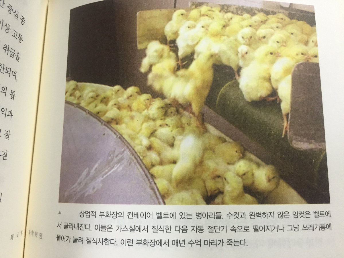 우리가 너무 좁아 닭은 똑바로 설 수 없고. 포유류 중 지능 뛰어난 돼지는 몸을 돌리지도 못하고. 젖소는 생애 대부분을 자기가 싼 대소변 위에 앉고 자고. 심리적 좌절 속에 한해 50억 마리 도축.