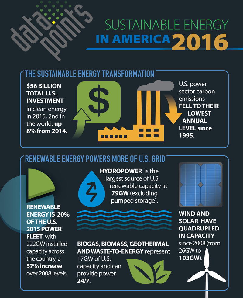 저 기사를 보다보니 기억 난 인포그래픽. 미국은 2015년 클린에너지에 560억 달러를 투자했고. 전체 전력 중 20%가 재생에너지다.