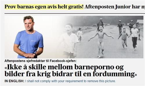 베트남전의 참상을 전한 1972년 퓰리처상 수상 사진보도. 노르웨이 작가가 자신의 페북에 올렸다가 삭제됐다. 이를 노르웨이 언론이 자사 페이스북에 다시 올리자 페북은 "사진을 삭제하거나 모자이크 처리하라"고 요구했고.. "아동 포르노와 역사적 전쟁 사진을 분간하지 못하는 페이스북의 무능력"을 질타당했다. 페북은 삭제 조치를 철회하고 저 사진을 복구했다.