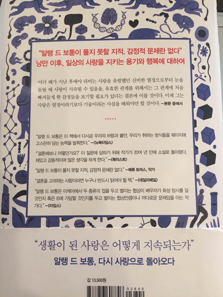 그가 21년 만에 장편소설을 냈다. "사랑에 대해 쓸 것이 충분히 생기면" 쓰겠다고 했다는 소설이다. 제목에서 드러나듯, 낭만적 연애를 거친 다음 사람들에게 벌어지는 일이다. 익숙하거나 은근 공감되는 솔직한 이야기를 지적인 언어로 풀어내는게 그의 장기. 내게는 결혼생활에 대한 심리 상담 같은 기분이 들었다. <왜 나는 너를 사랑하는가> 실제 출간된 건 93년이고 원제가 <Essays in Love> 라면, 2016년 이 책의 제목은 사실 <The Course of Love>. 이러나 저러나 사랑 타령들. 사실 사랑 빼면 인생 뭣이 중헌디.