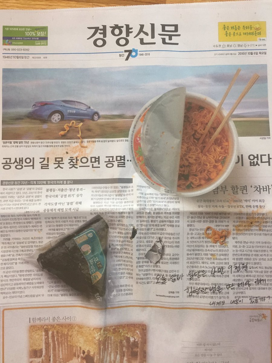 배달 과정에서 뭐 묻은건가 손으로 만져보기까지. "오늘 알바 일당은 4만9천원, 김영란법은 딴 세상 얘기, 내게도 내일이 있을까?' 낙서까지 인쇄된 경향 70주년 1면. 신문 얘기는 딴 세상인 그들에겐 컵라면 밥상 깔개로나. 마침 중앙 1면도 딴 세상