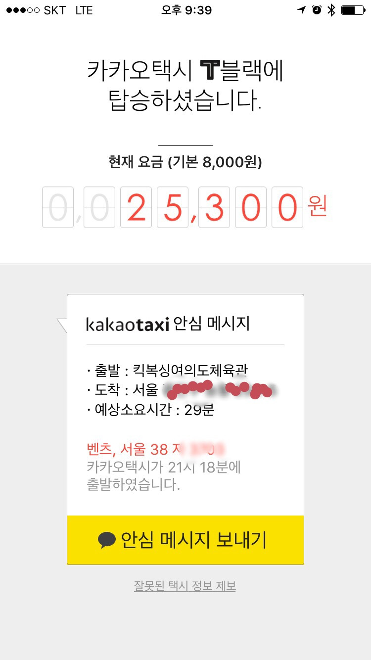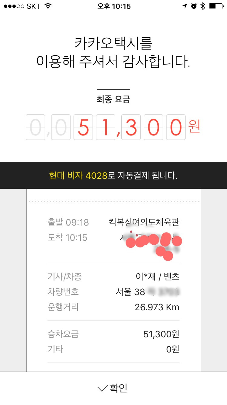 10초 정도 지나서, 바로 차량이 배정됐습니다. 여의도 원효대교 남단 사거리였는데, IFC몰 부근 콘래드 호텔의 차량이 움직이는게 지도에 뜨더군요. 2분 정도 지나 차량이 도착했습니다. 미리 차 번호를 확인한데다, 직전에 기사님이 제게 전화를 주셨습니다.