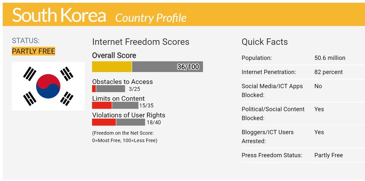 @gjack 오늘, 프리덤하우스가 매년 발표하는 인터넷 자유도( #FreedomontheNet ) 발간. 한국은 지난해 비해서도 두단계 내려간 36점을 받았음한국은 여전히 인터넷 완전 자유국이 아니고 '부분 자유국'인 상황.