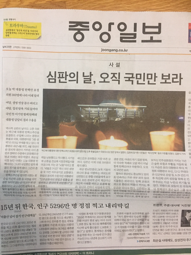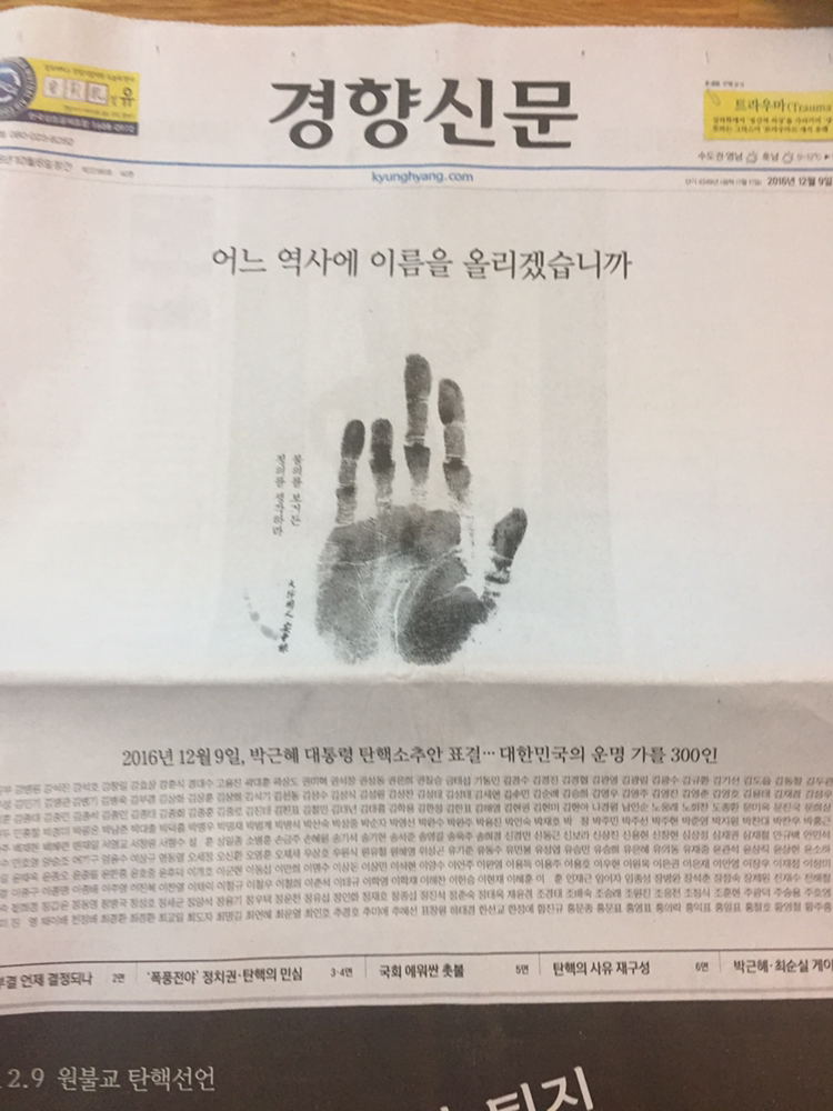 집에서 보는 2개 신문의 1면 톱. 통사설도, 이미지와 300명 이름만 올린 쪽도..