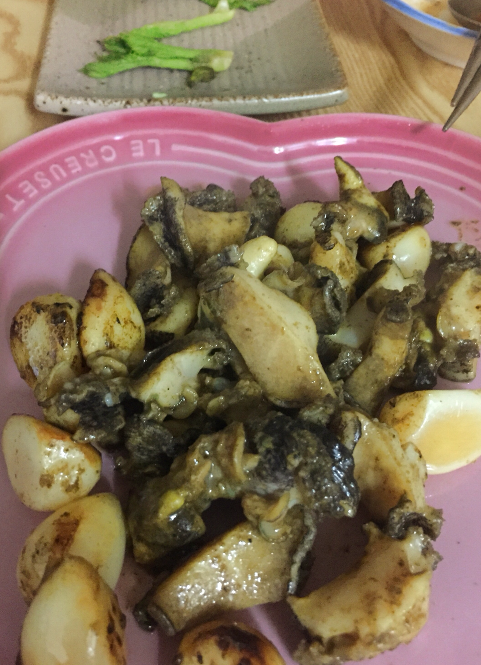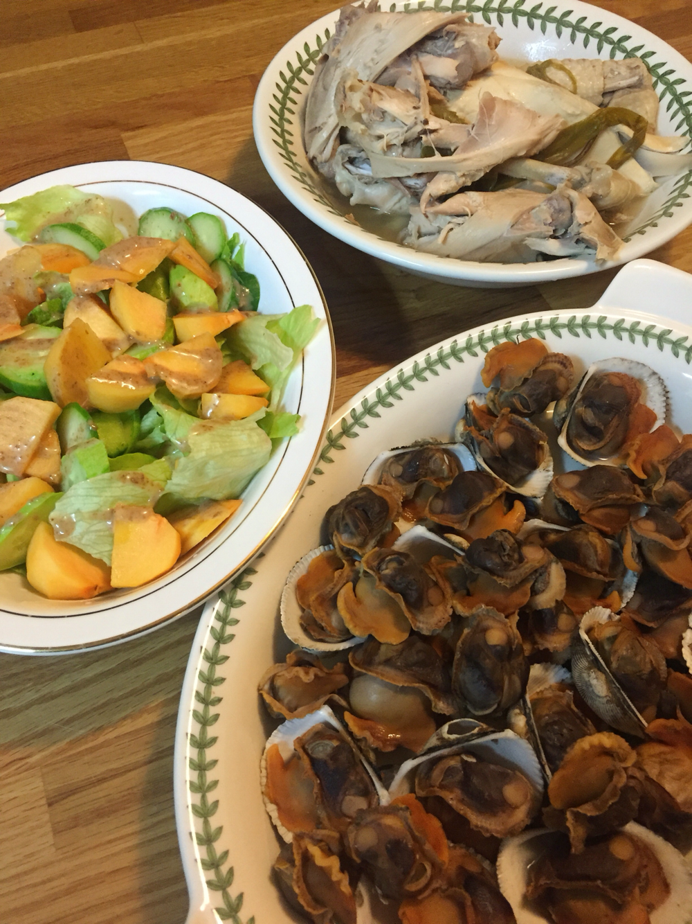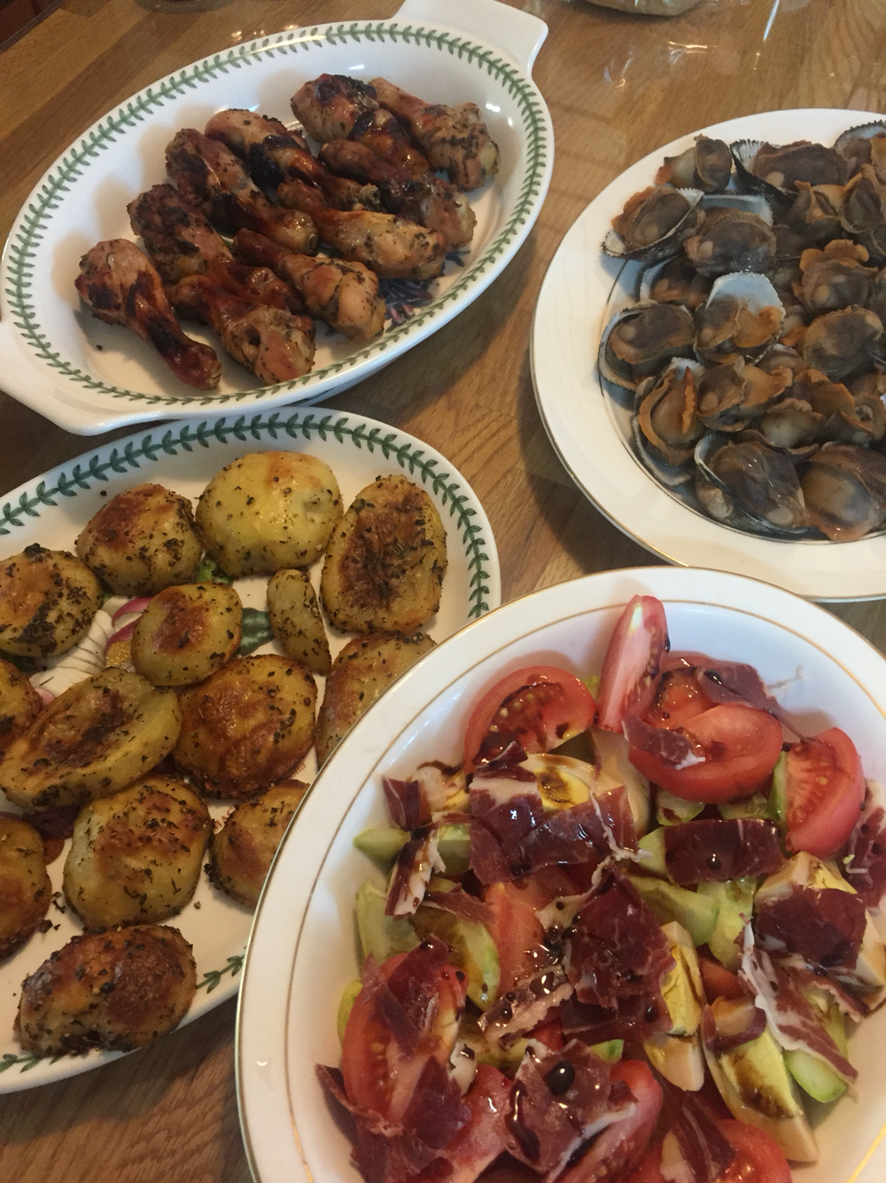 36. 피조개는 박박 문질러 씻고 해감하고 손이 꽤 간다. 그래도 입 안 가득 터질듯한 식감과 비릿한 맛이 좋긴 하다. 듯템한 하몽은 토마토 샐러드에 올렸는데 애들은 안 좋아했다. 치킨과 감자는 오븐에 같이 구웠다.