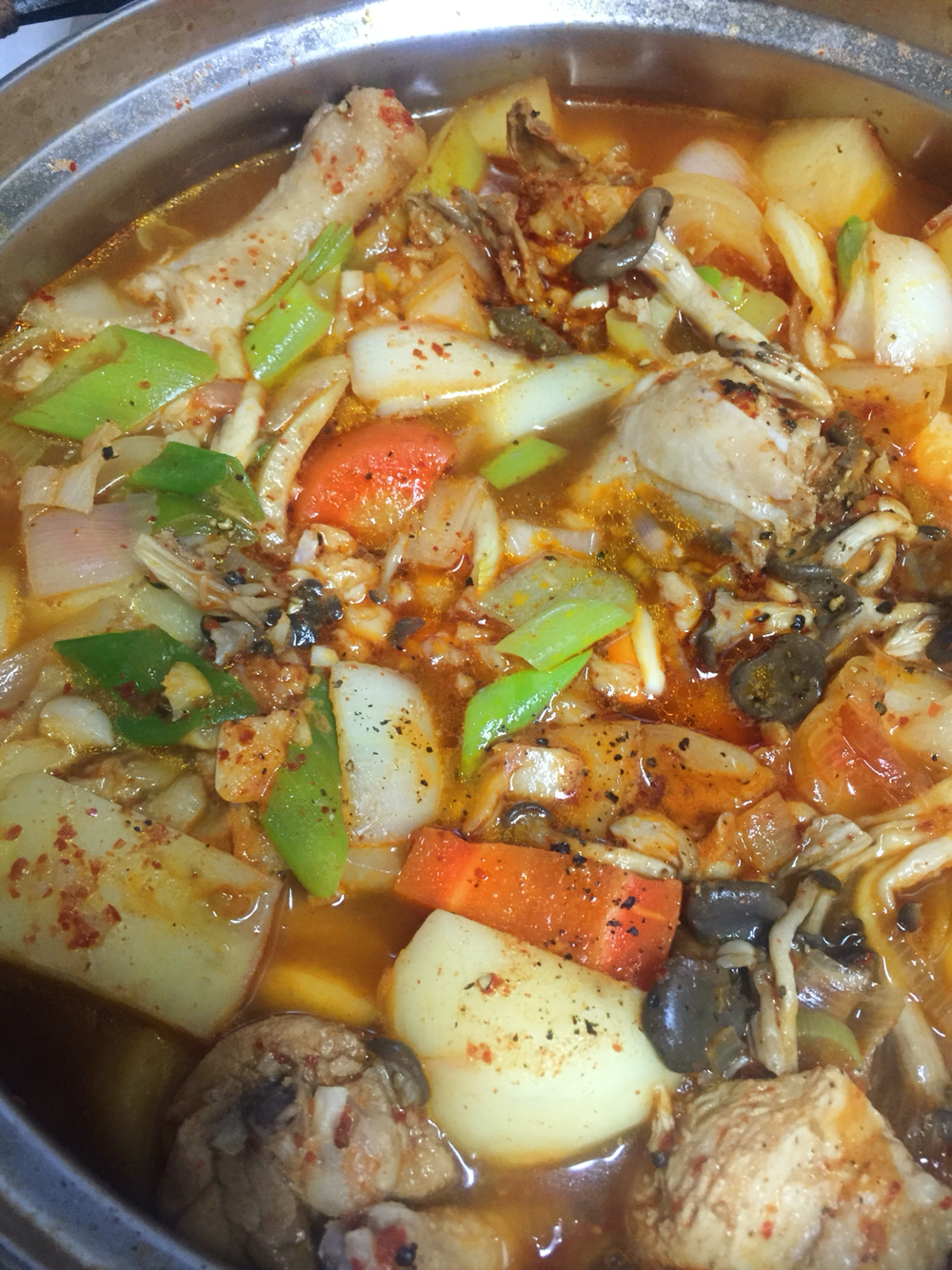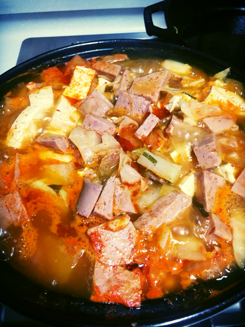 32. 남은 오리고기 몇 조각 보이길래. 다시마 육수에 무와 감자 양배추 양파 대파마늘 썰어넣고 김치 쪼가리와 국물로 부대찌개. 그런데 무념무상으로 했는지 양 맞추는데 실패. 햄과 두부까지 넣으니 넘쳐서 온통 지저분