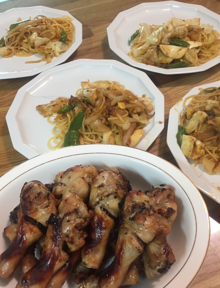 44. 닭다리만 두 팩 오븐에 굽고. 세일 때 사서 얼려놓았다가 장 못 본 즈음에 활용. 태국여행 다녀온 M가 선물로 준 팟타이 소스 훌륭. 냉장고 뒤져 양파 양배추 파마늘 고추 삶은 계란까지. 면은 파스타로. 굿
