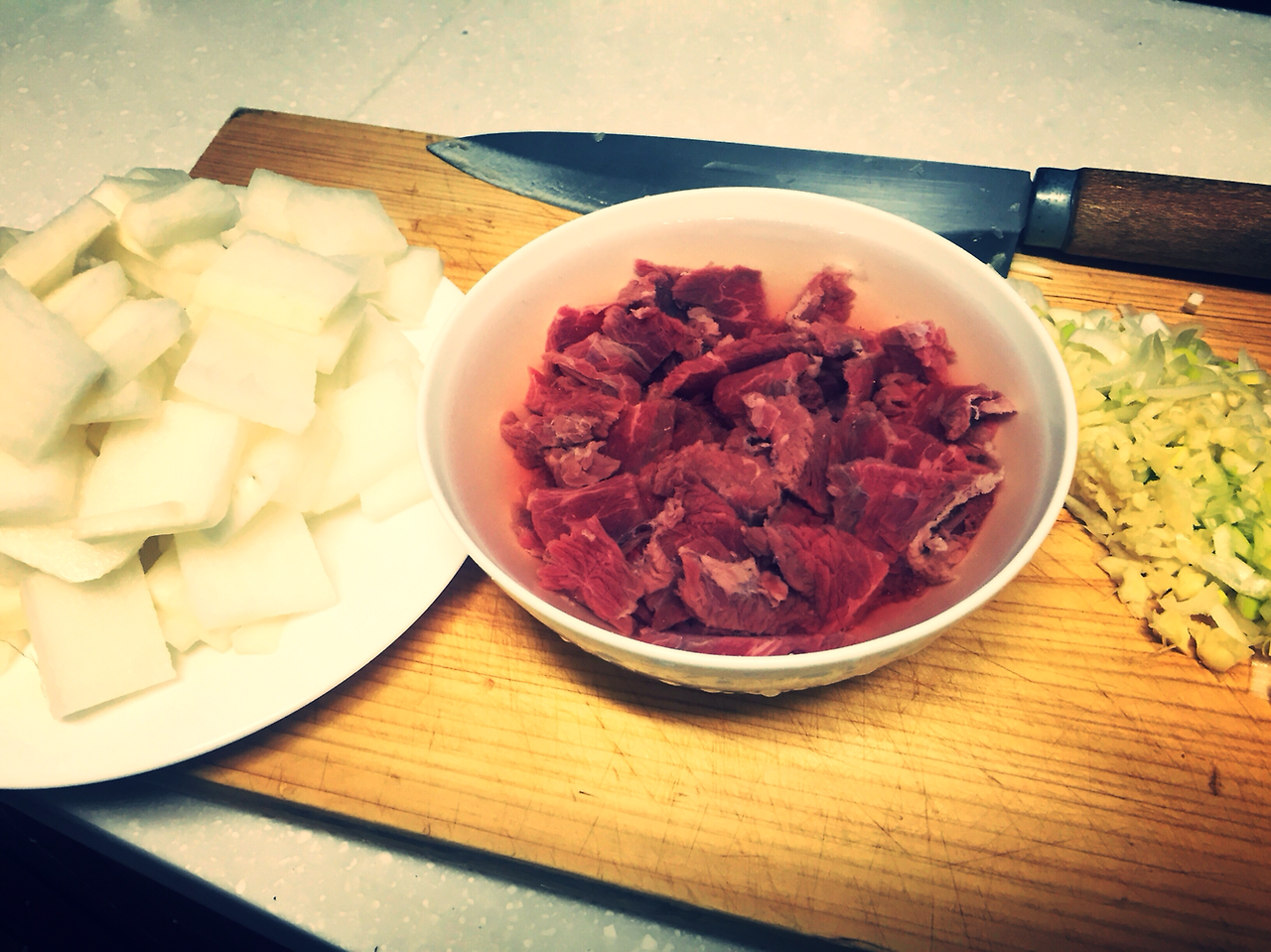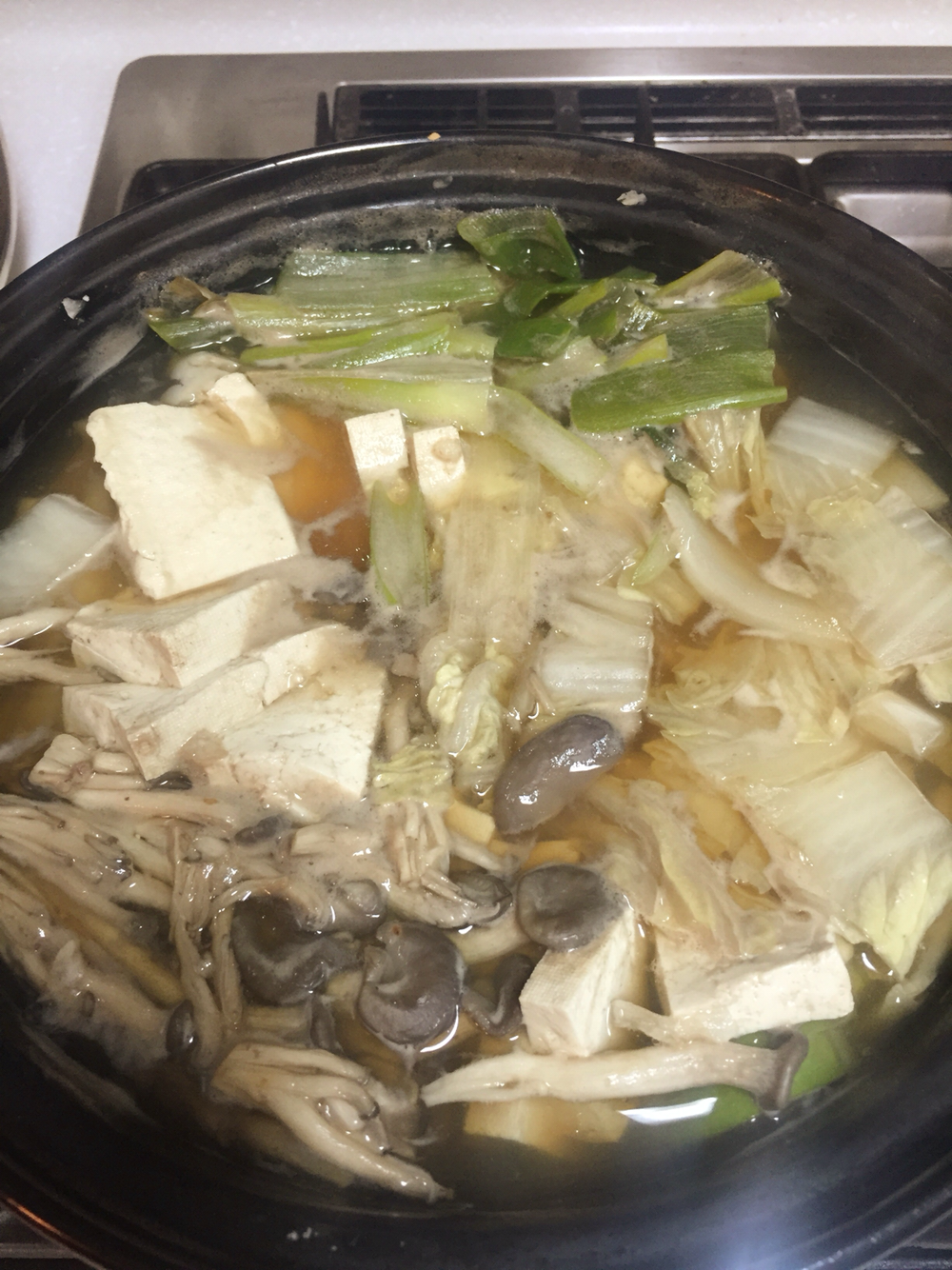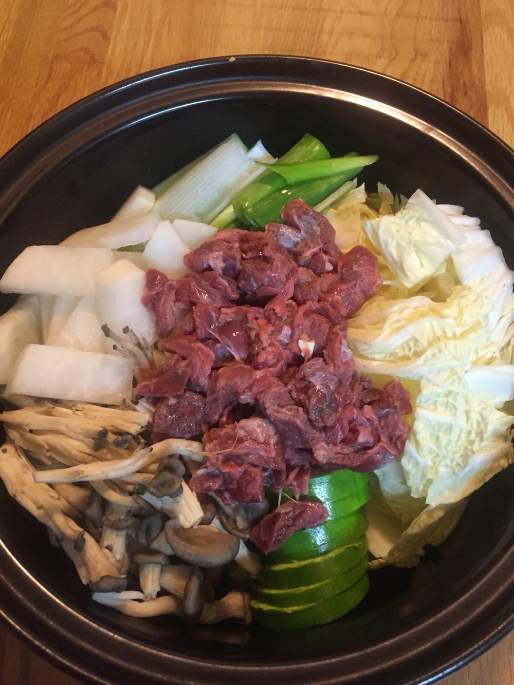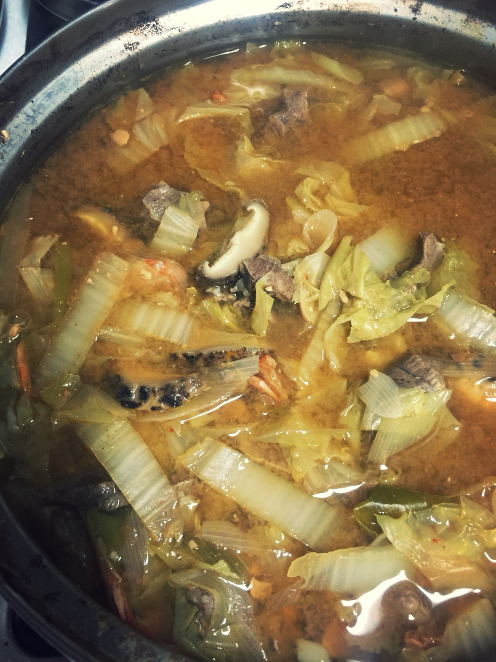 4. 배추와 파 마늘 듬뿍. 상대적으로 오래 익혀야 하는 무를 조금 얇게 썰고. 버섯 호박 두부에 핏물 뺀 쇠고기까지. 모든 재료를 썰기만 하면 끝. 국간장과 소금간 국물이 쥑인다. 종일 해장이 필요했는데 이제야ㅠ