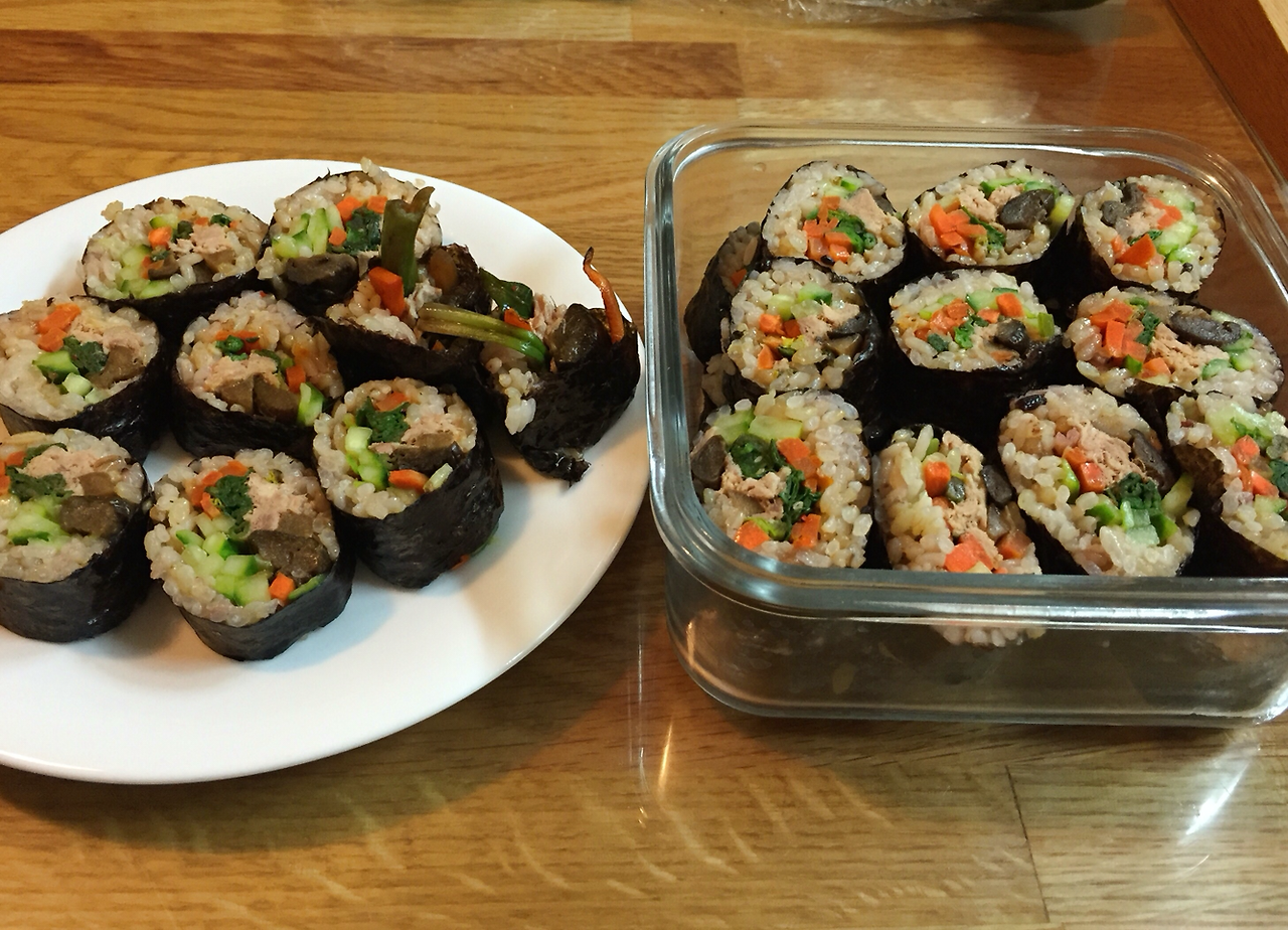 5. 우엉조림에 새콤 오이만 넣었다. 밥에는 소금과 참기름만 하려다가 오이 촛물 남은걸 넣어버렸더니 막 섞이는 맛. 그래도 그럭저럭 굿. 남은 쇠고기버섯 전골을 곁들였는데 아들이 "김밥엔 라면이지" 걍 또 끓여줬다