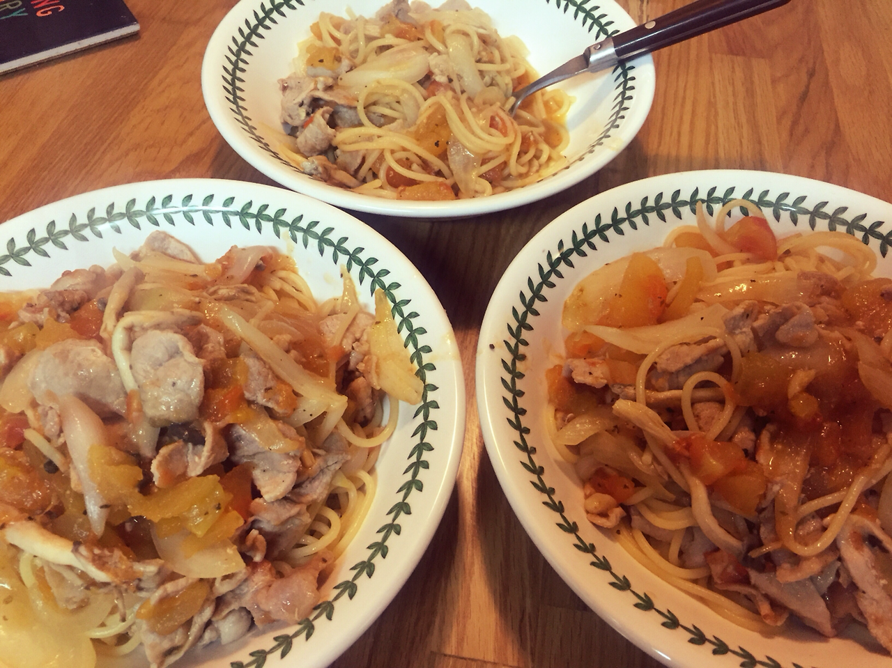 6. 무항생제 돼지고기를 싸게 사서 불고기 하려다..상해가는 토마토 발견. 메뉴 바꿔 토마토 안좋은 부분 떼어내고 데쳐서 껍질 벗긴뒤 소금바질로 푹 익혔다. 마늘고기양파버섯 소금후추로 볶다가 토마토까지 파스타 비슷