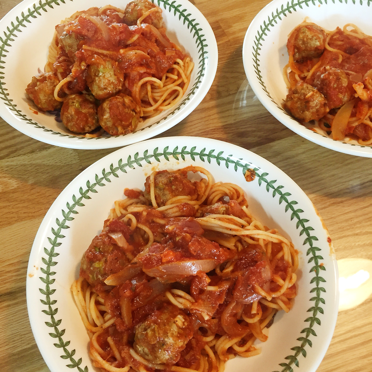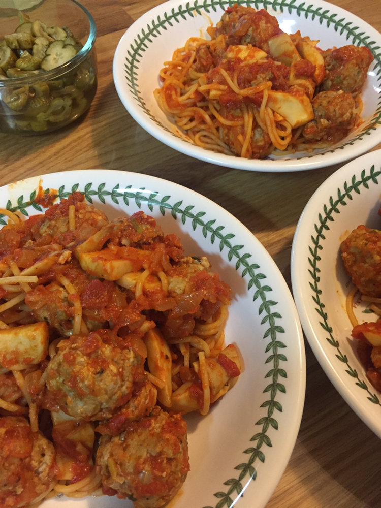 30. 갈은 돼지고기 반값에 득템했다가 그냥 얼려놨는데. 어제 쇠고기 갈은거 반값. 합쳐서 파를 정말 넉넉히+양파마늘 다져넣고 소금후추로 미트볼 만들어 오븐에 구웠다. 양파와 껍질벗긴 토마토 볶다가 시판소스로 파스타