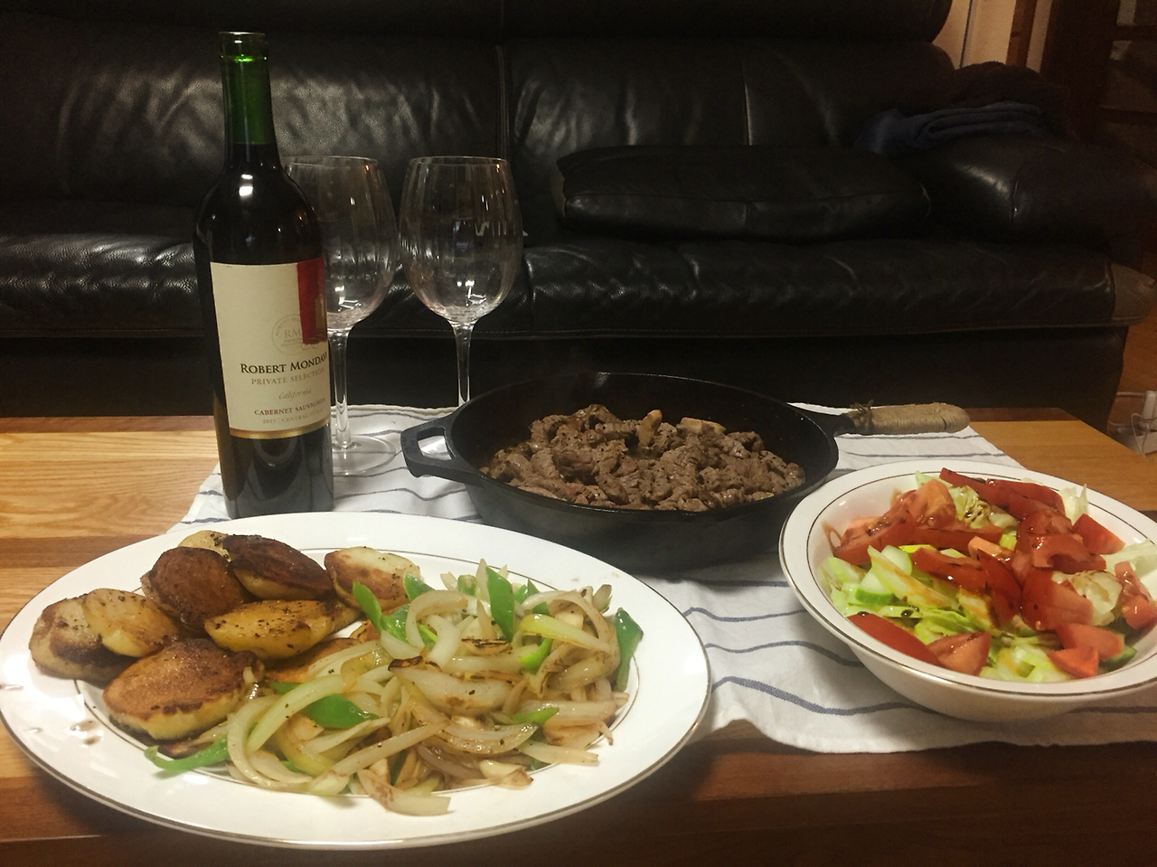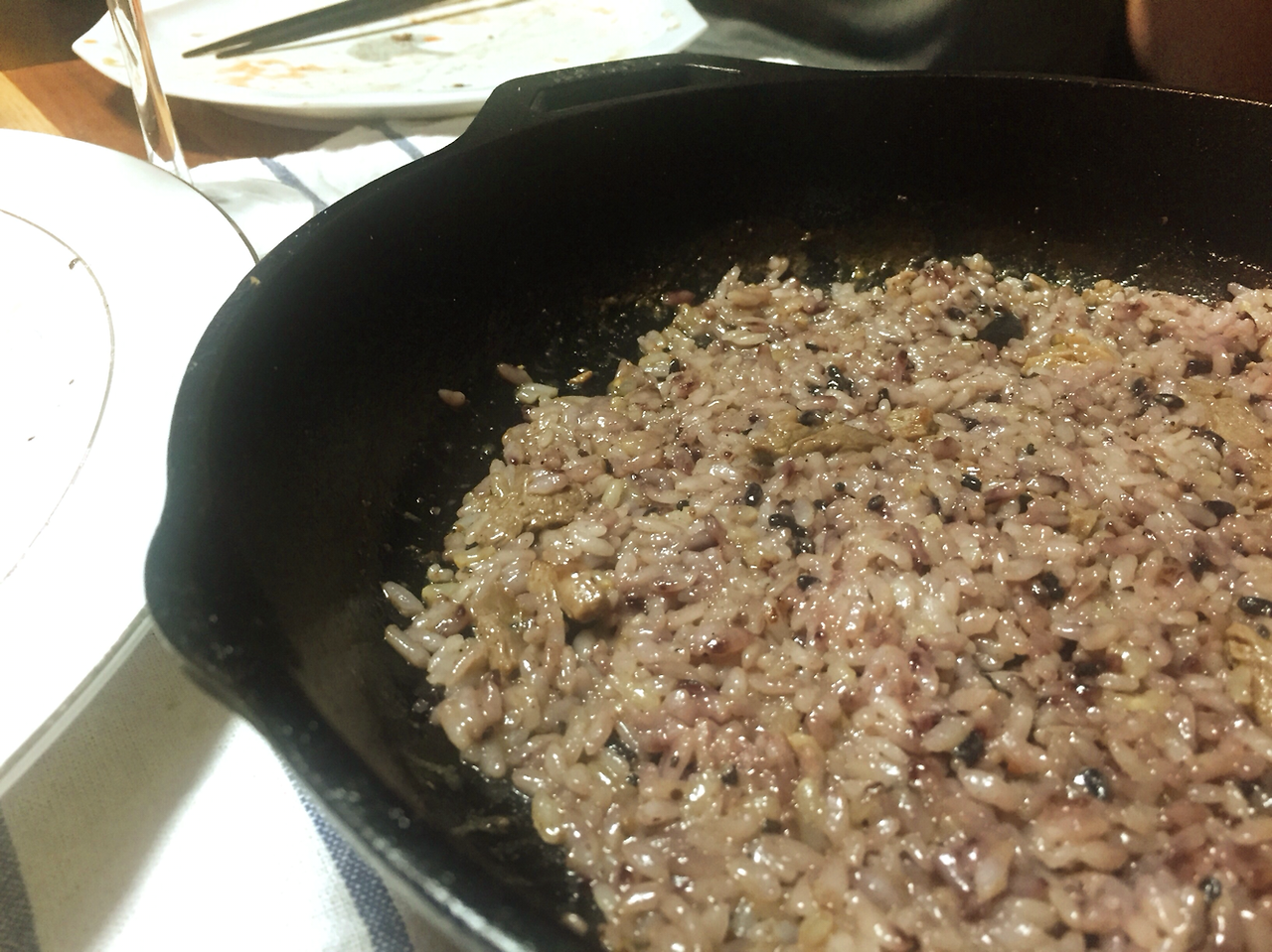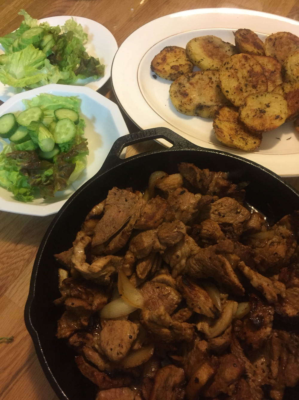 2. 감자구이는 팬이 아니라 오븐에 했어야 한다고 후회. 살짝 데친뒤 올리브유에 소금후추바질버터로 맛을 냈다. 아빠와 아들은 좋다고. 그 팬에다 고기도 굽고. 그 국물에 밥을 살짝 볶은게 굿. 사진 촬영은 따님이.