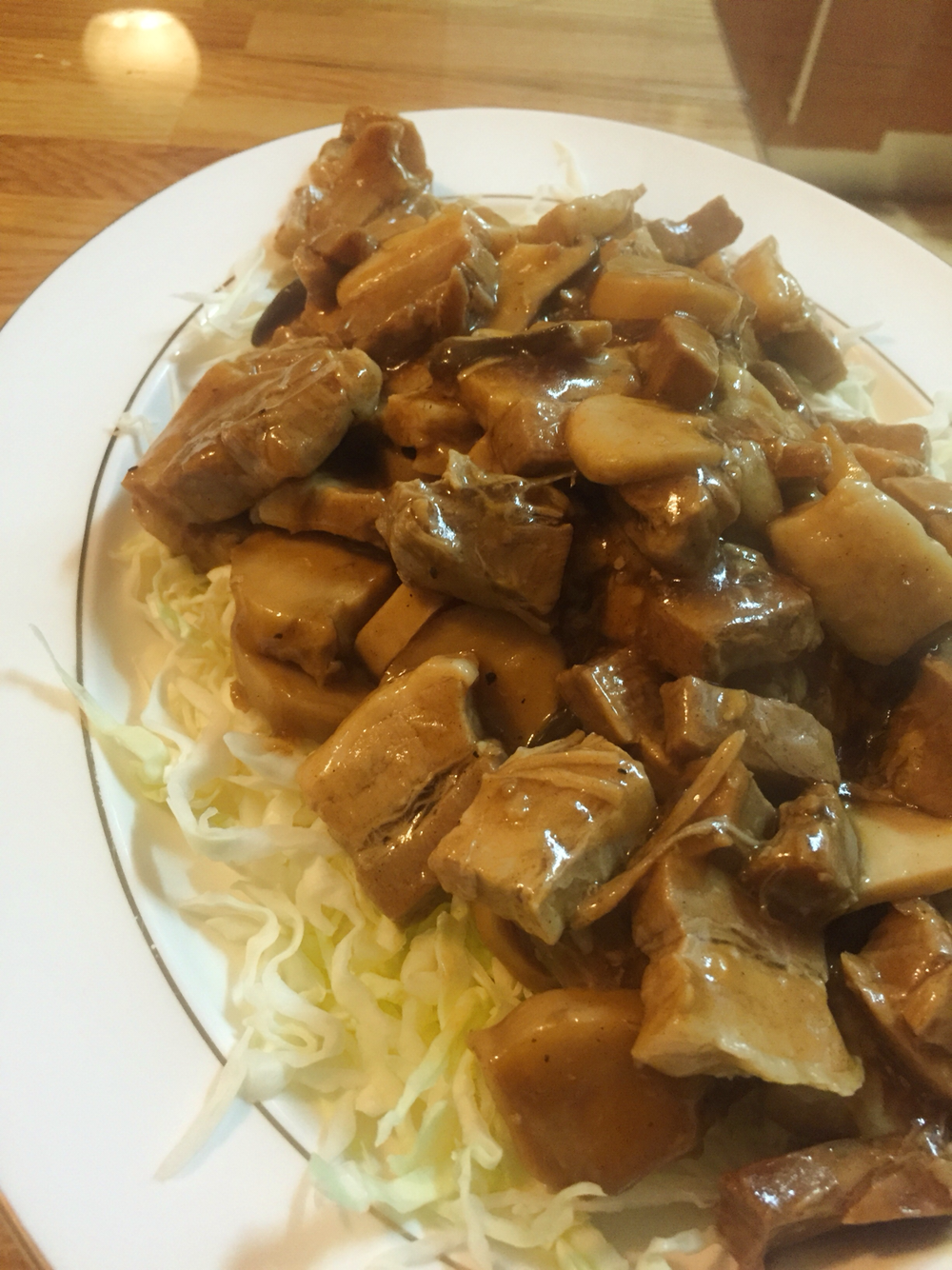 11. 점심 보쌈이 좀 많이 남아 재활용. 초간단 버전 동파육. 육수에 간장 굴소스 보글보글 졸이다가 전분물로 걸쭉하게 마무리. 계피가루가 비법. 파채 대신 양배추채 위에 올렸다. 흑설탕 깜빡. 양 늘리려 버섯 추가